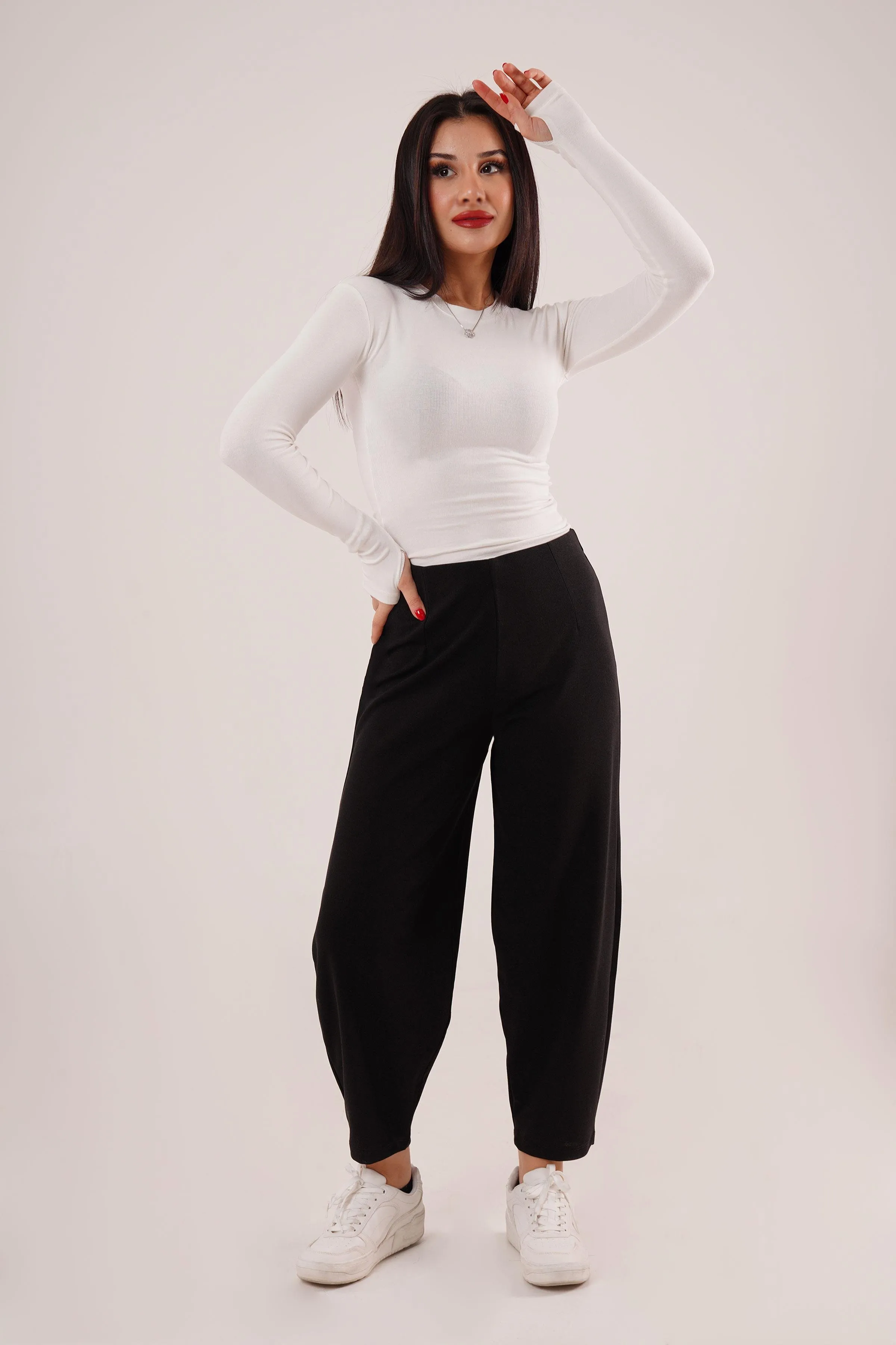 بنطلون واسع الساق بقماش مجعد وخصر مطاطي، يجمع بين الراحة السهلة والأناقة الملمسية لإطلالة كاجوال وعصرية.