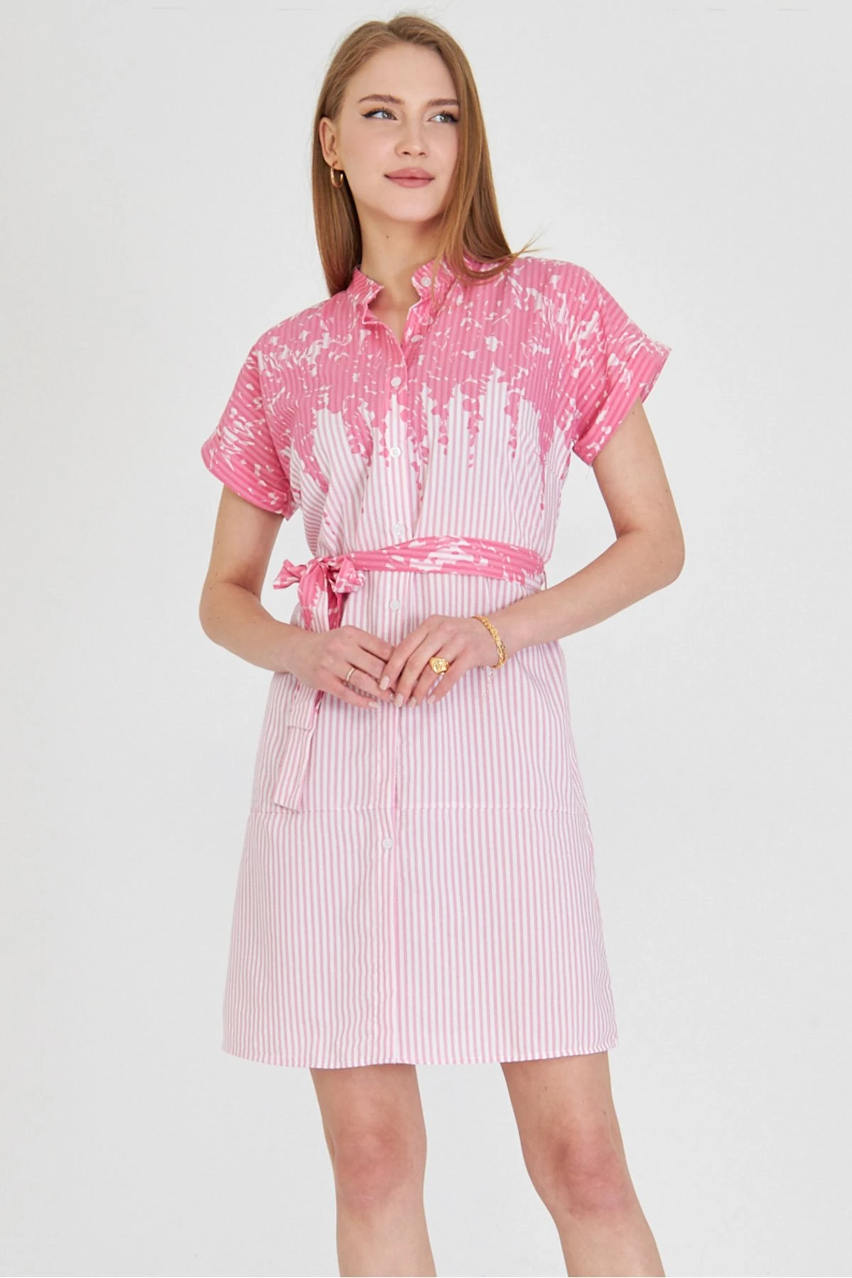 فستان ميدي بأكمام قصيرة وتفاصيل كشكشة مع ياقة دائرية ناعمة، يمنحك لمسة حيوية وأنوثة تناسب جلسات البرانش أو أي مناسبة تحتاجين فيها لإحساس بالفرح والتجدد.