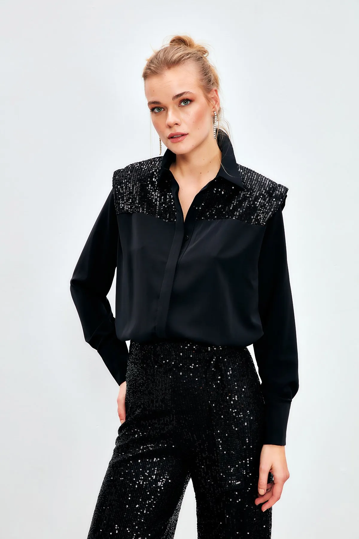 قميص نسائي سادة كبير الحجم بأكمام طويلة، مصنوع من قماش موسلين ناعم وخفيف الوزن يوفر مظهرًا مريحًا وأنيقًا مثاليًا للارتداء اليومي.