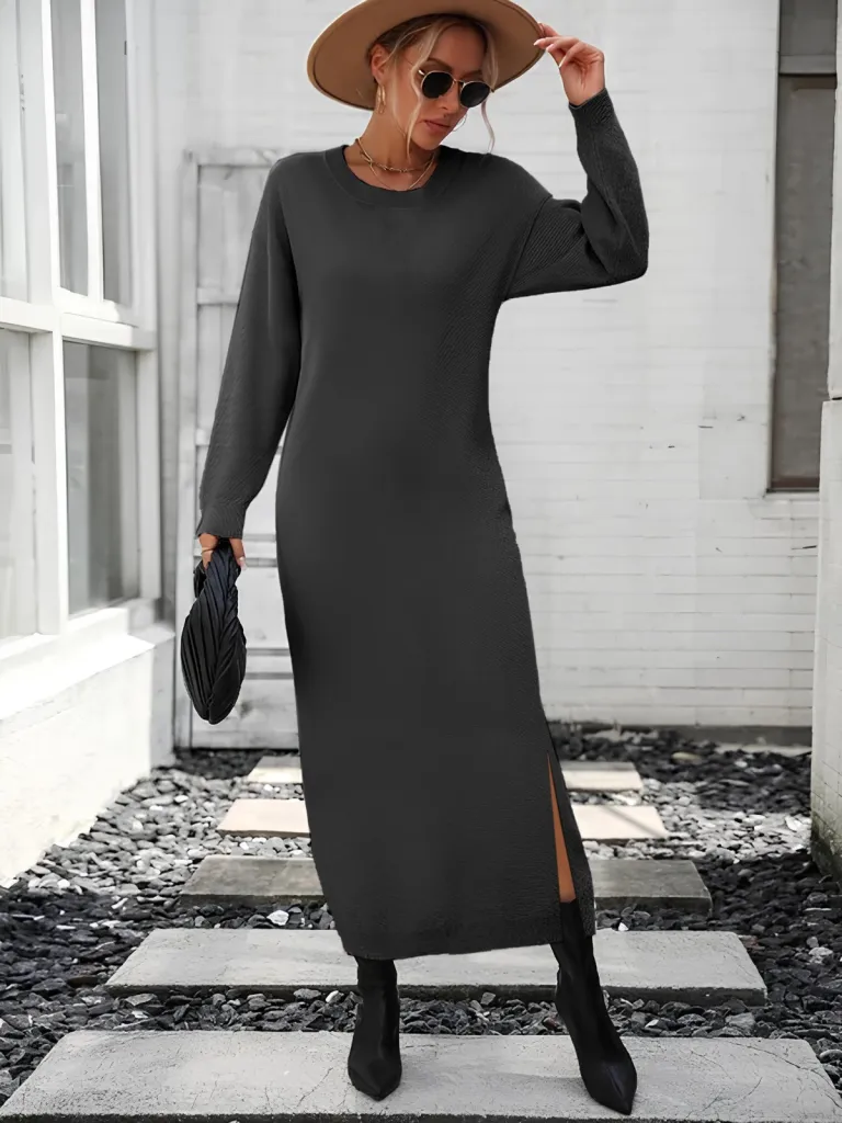 اختبري الأناقة الكاجوال مع فستان متوسط الطول بأكمام قصيرة وياقة دائرية مزين بتفاصيل خطوط ناعمة، مثالي للارتداء اليومي أو أيام العمل المريحة.