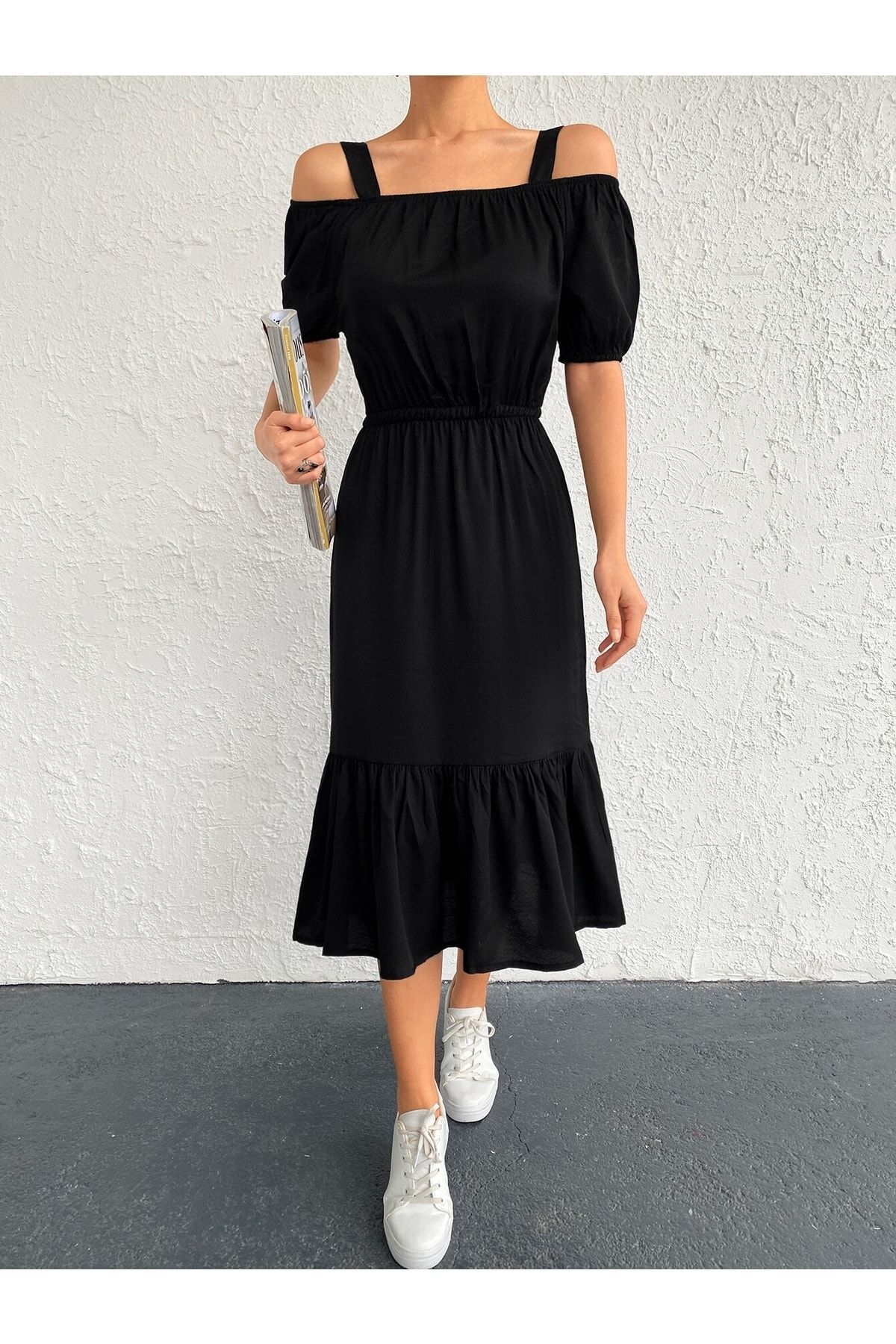ياقة على شكل V مع التصميم بدون أكمام تمنح هذا الفستان الميدي لمسة كلاسيكية أنيقة، مناسب لجلسات العصر، عشاء أنيق، أو أي مناسبة تبحثين فيها عن إطلالة راقية بدون عناء.
