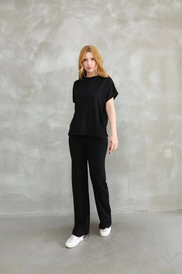 طقم فيسكوز خفيف مع بلوزة بأزرار على الكتف وبنطلون واسع لإطلالة صيفية مريحة وعملية