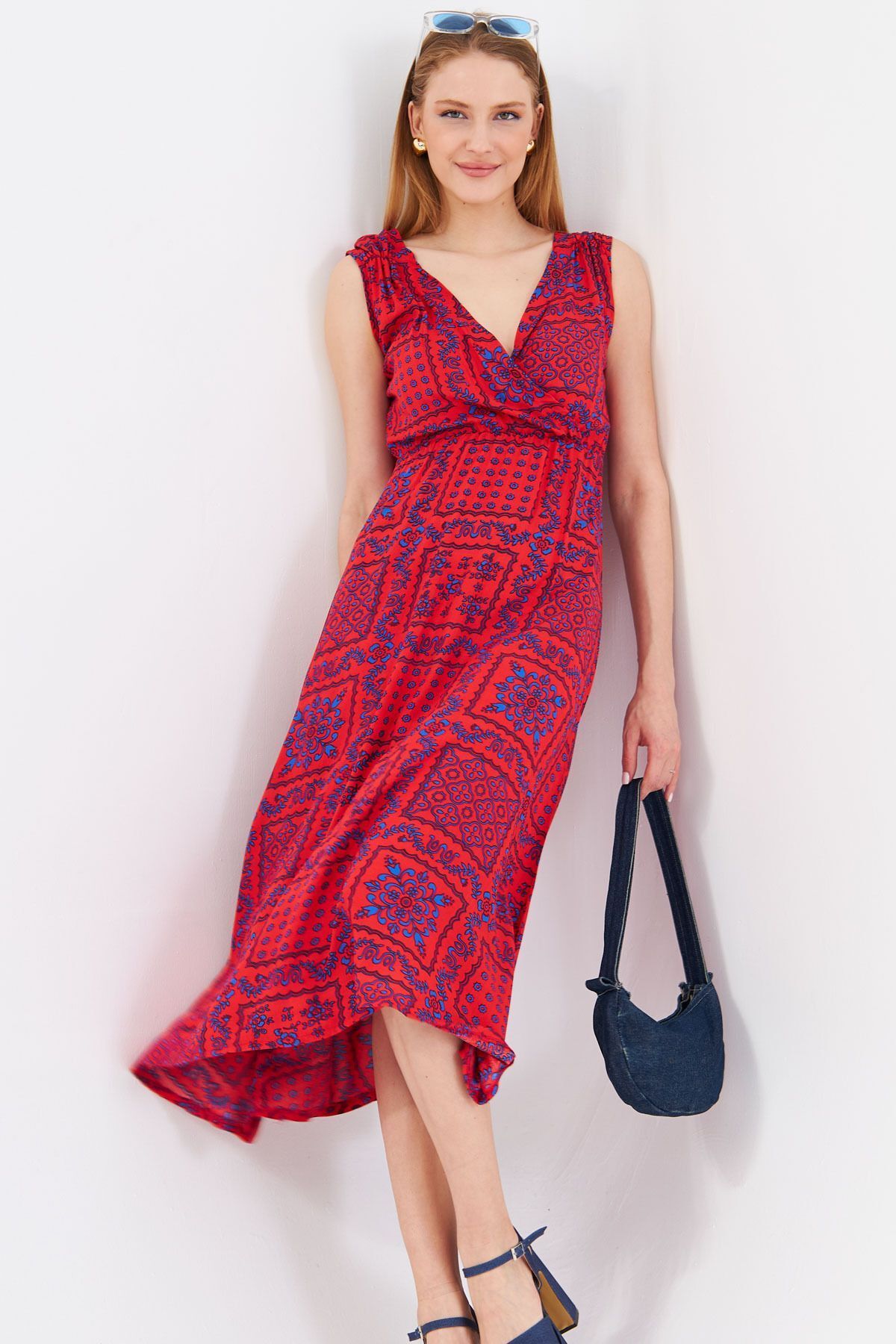 استمتعي بسحر الكلاسيكية مع فستان ميدي منقوش بدون أكمام مزود بحزام يحدد الخصر، مثالي لأيام العمل الكاجوال أو استراحات القهوة في عطلة نهاية الأسبوع حيث يجتمع الراحة والأناقة.