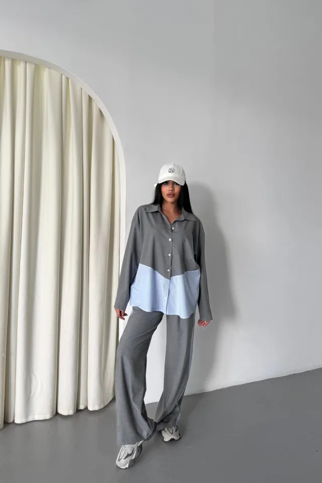 طقم نسائي صيفي من الكتان، يتكون من بلوزة قصيرة بياقة مربعة وأكمام منفوخة وبنطال بحزام منسوج. قماشه خفيف الوزن وجيد التهوية.