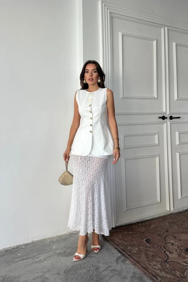 فيست كتان موحد اللون بدون أكمام بياقة لف مزدوجة مع خصر برباط وتصميم مبطن مثالي للطبقات الصيفية العصرية.