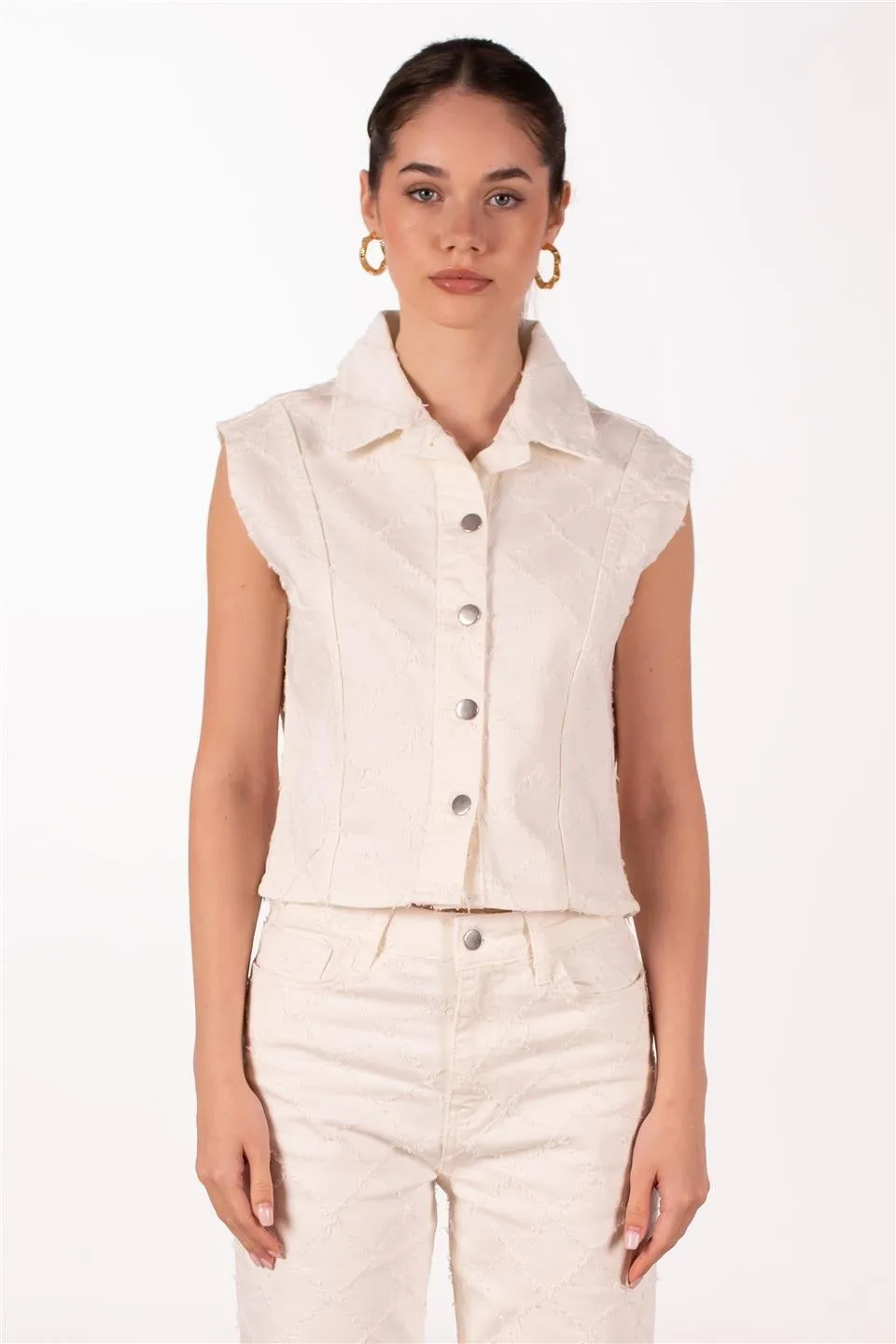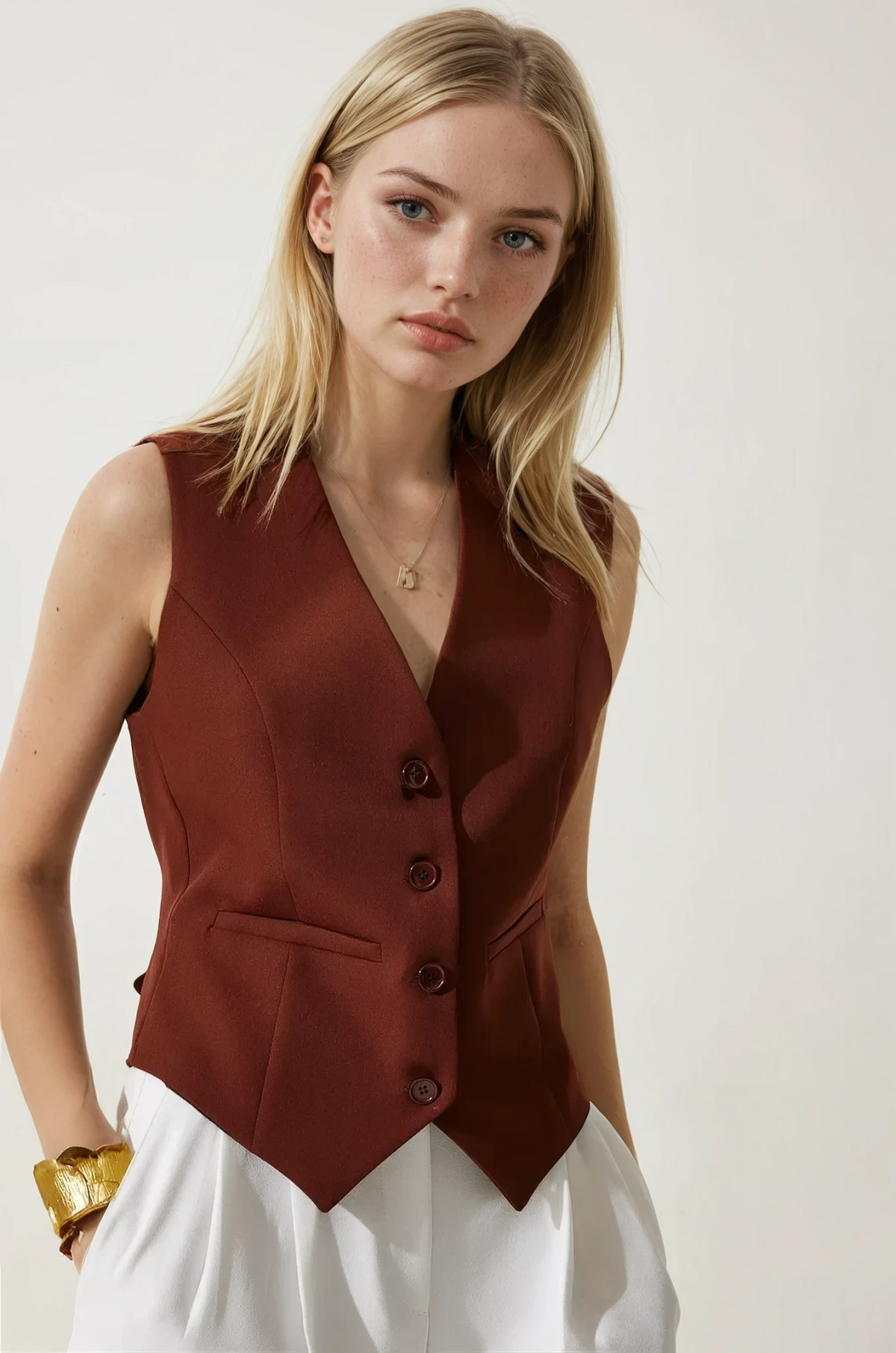 فيست كتان موحد اللون بدون أكمام بياقة لف مزدوجة مع خصر برباط وتصميم مبطن مثالي للطبقات الصيفية العصرية.