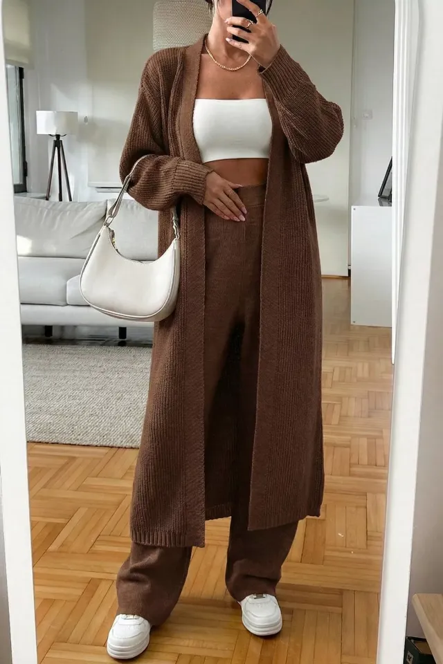 طقم بلوزة نسائية قصيرة مزدوجة الصدر، بياقة لف و خصر مربوط، مع بنطال واسع الساقين. قماش ناعم يسمح بمرور الهواء، يمنحكِ الأناقة والراحة.