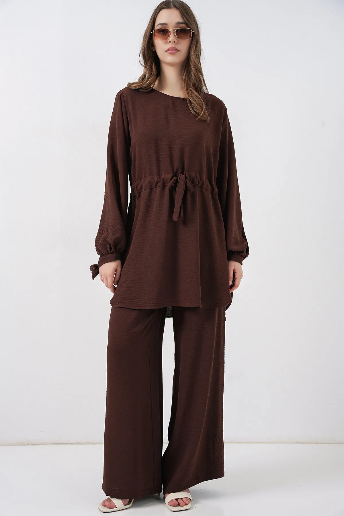 طقم بلوزة نسائية قصيرة مزدوجة الصدر، بياقة لف و خصر مربوط، مع بنطال واسع الساقين. قماش ناعم يسمح بمرور الهواء، يمنحكِ الأناقة والراحة.