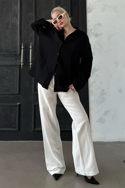 قميص نسائي مخطط بأكمام طويلة وتفاصيل مطوية وربطة جانبية، يجمع بين الراحة والأناقة بأسلوب عصري غير رسمي.