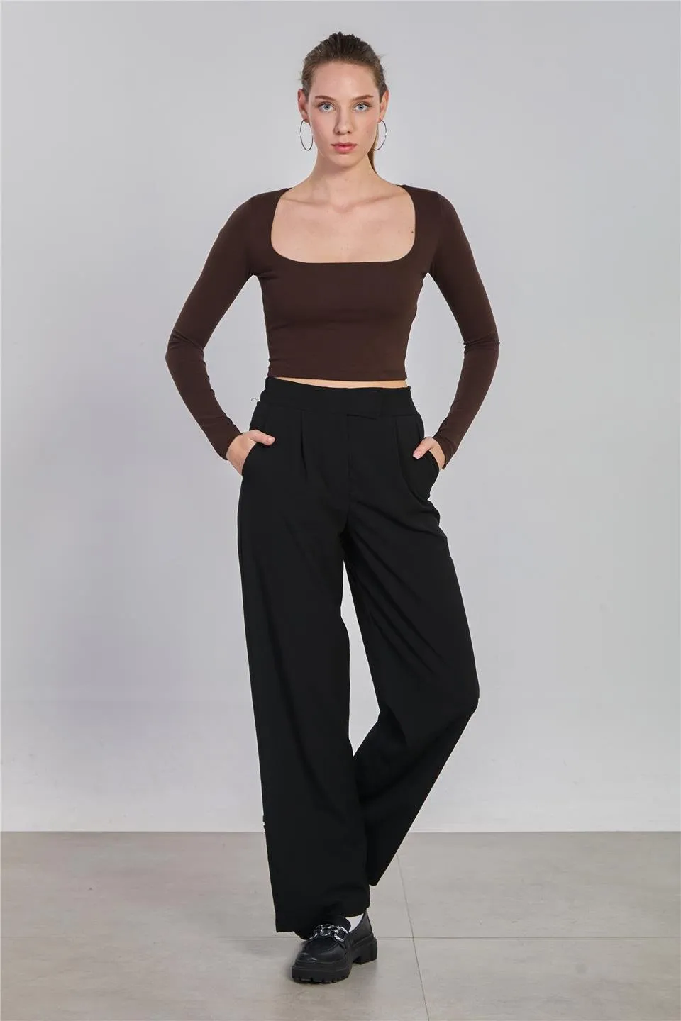 بنطلون بالازو بخصر مرتفع مع تفاصيل طيات أنيقة وأزرار تزيينية، يمنحك إطلالة راقية وعصرية بلا مجهود.