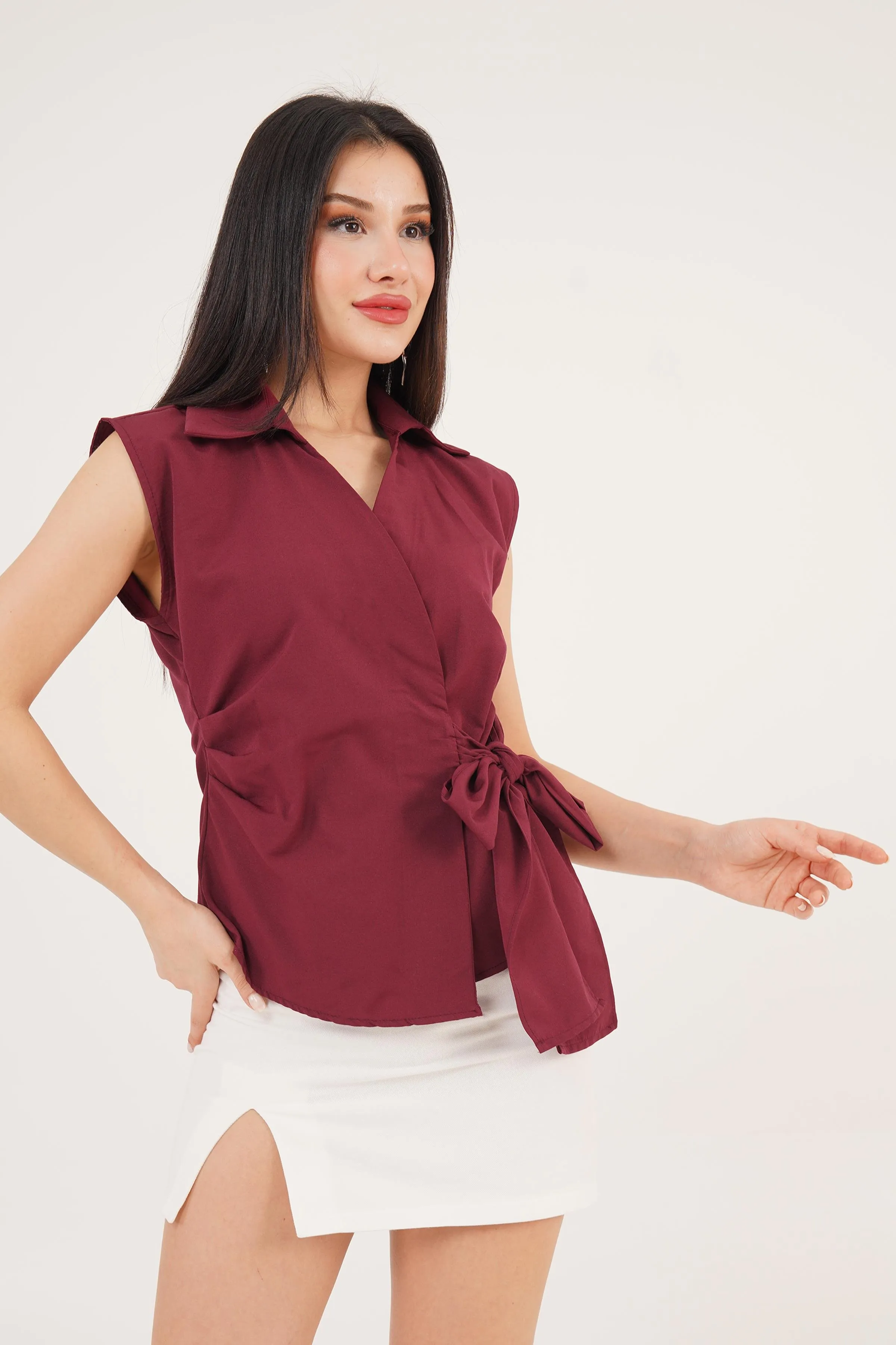 قميص نسائي بدون أكمام بنمط لف و تفاصيل عقدة