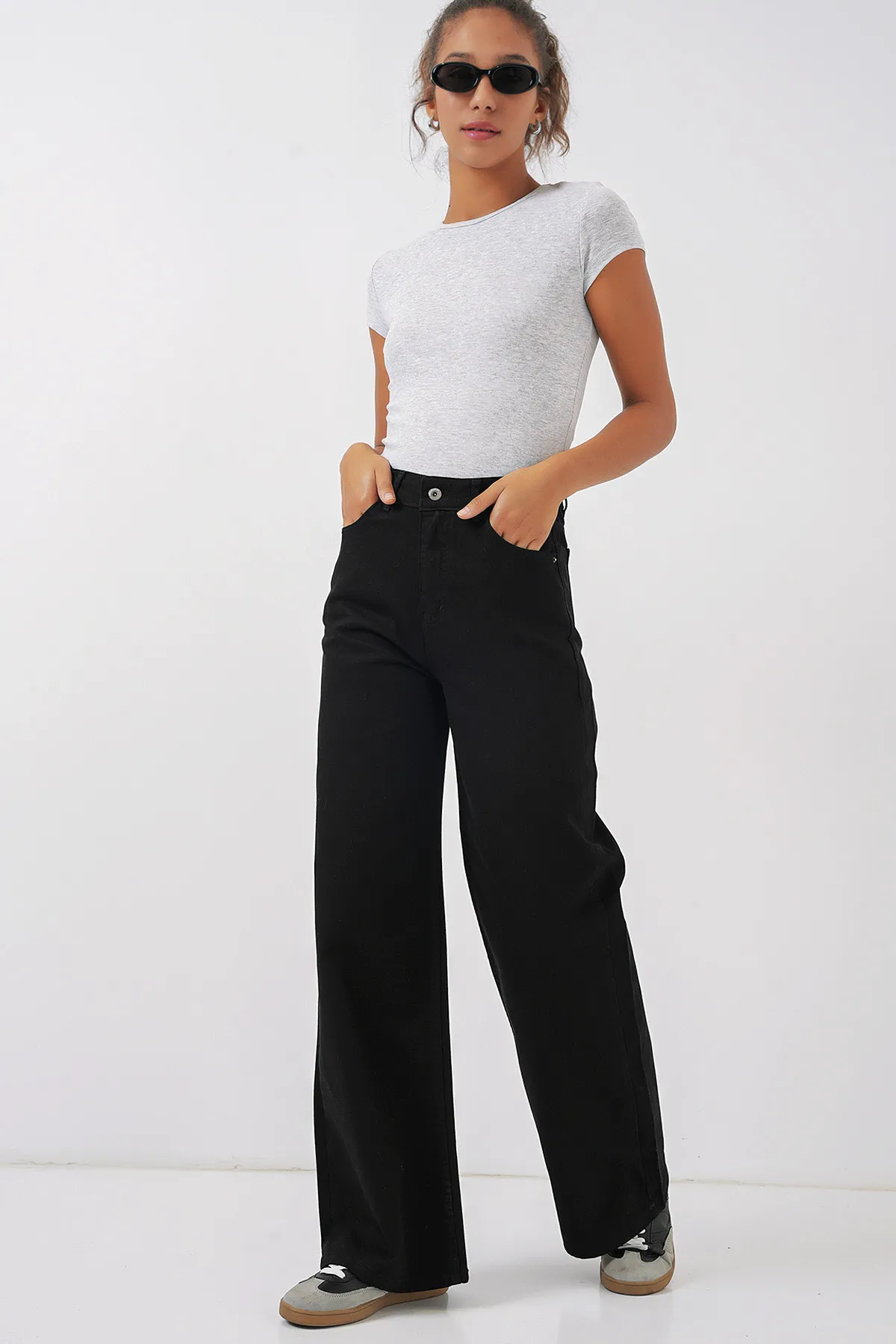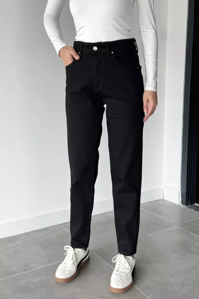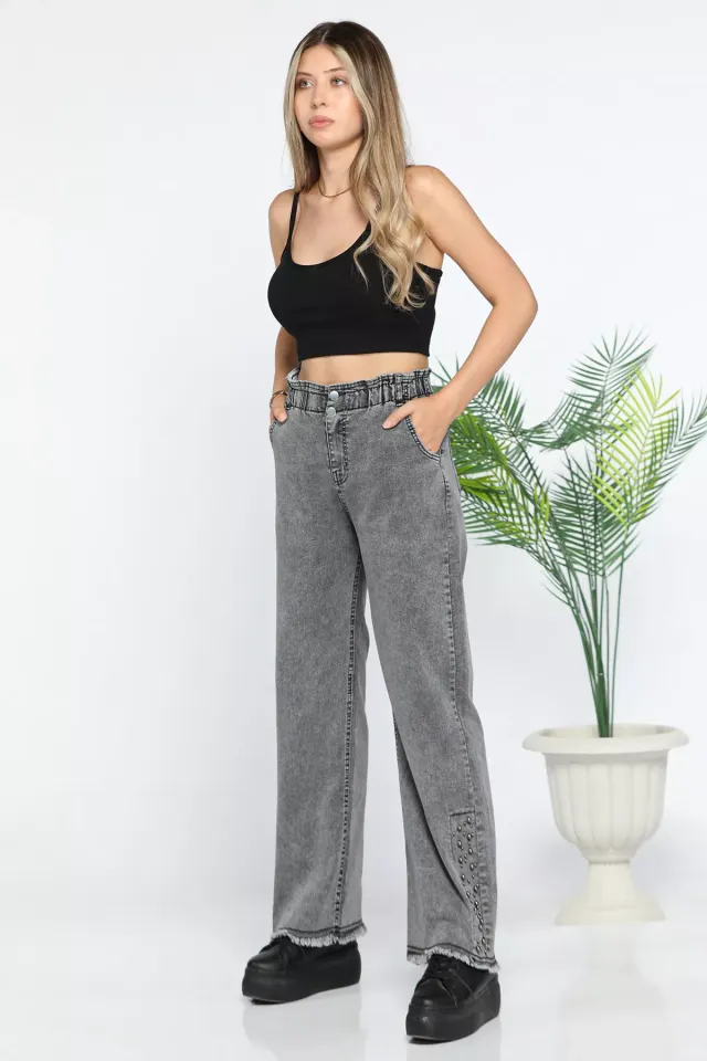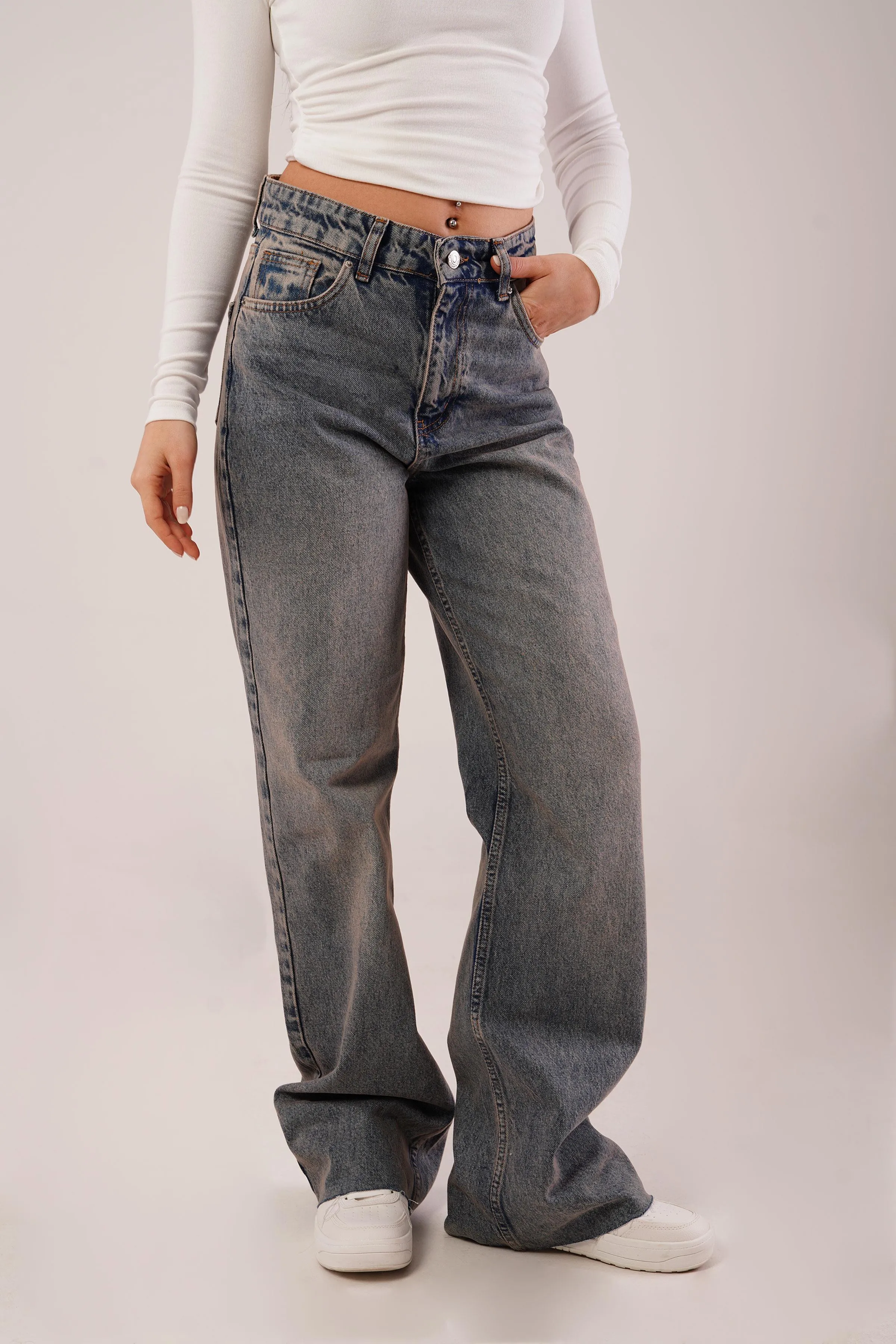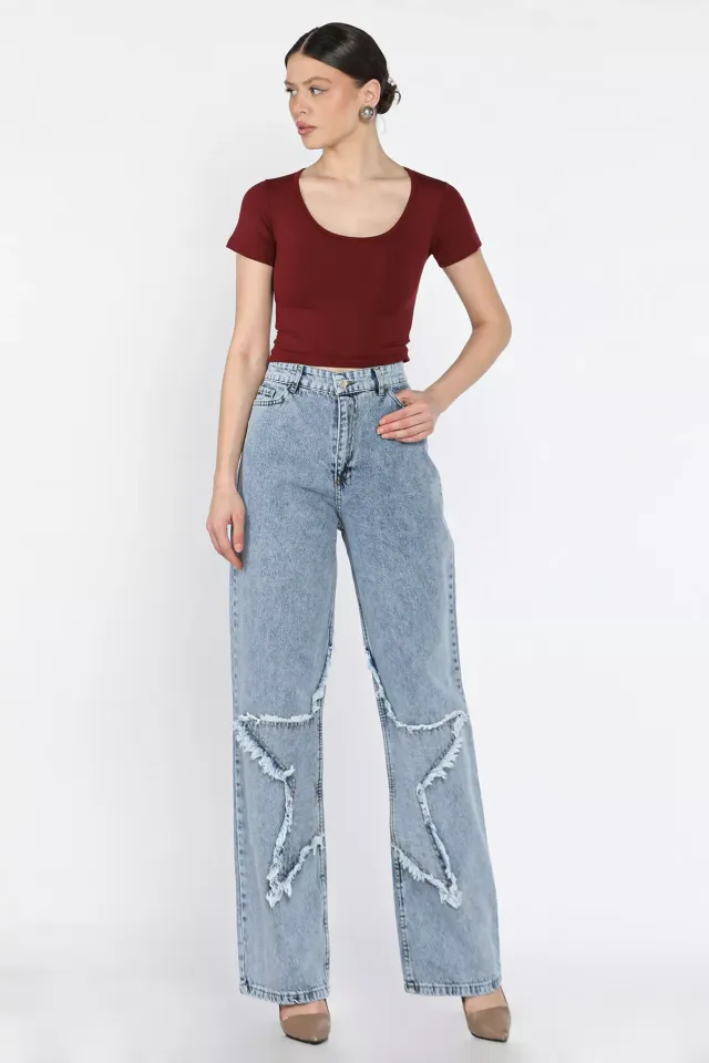 بنطلون جينز بقصة مستقيمة وخصر عالي مع حواف مقصوصة وجيوب مزدوجة عملية، يجمع بين العصرية والراحة اليومية.