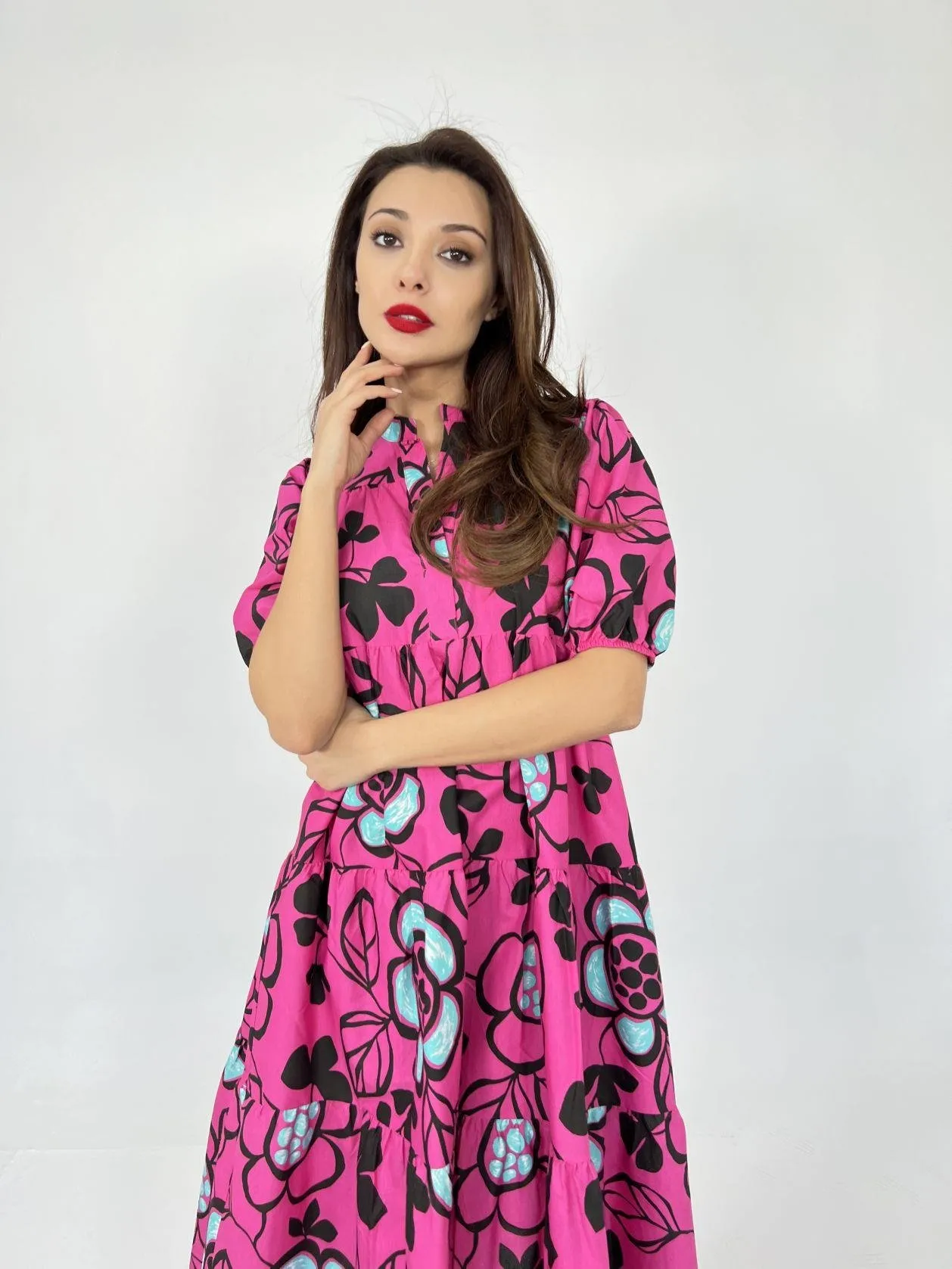 فستان ميدي دانتيل بنقشة زهور بياقة قلب وأكمام قصيرة لإطلالة صيفية أنثوية راقية