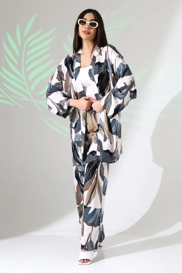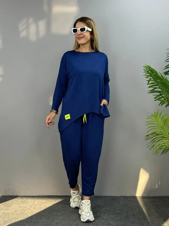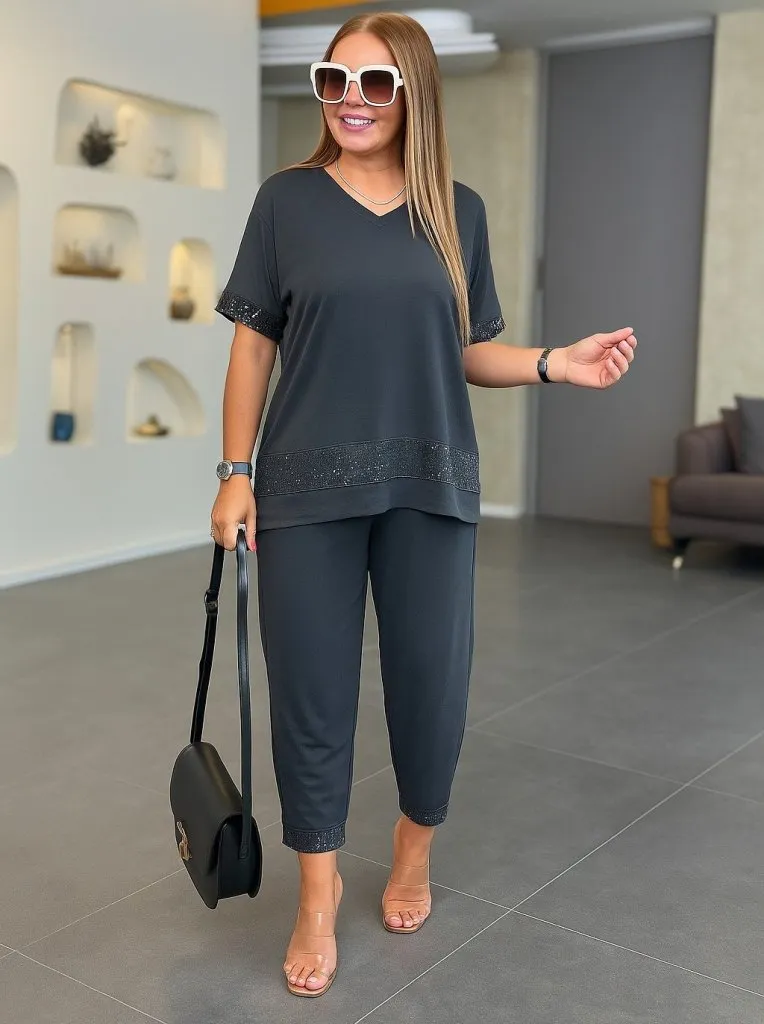 طقم قطني مزين بتطريز كتابي مع تيشيرت بياقة دائرية وبنطلون واسع بخصر مطاطي وجيوب، مثالي لإطلالة صيفية مريحة للنساء.