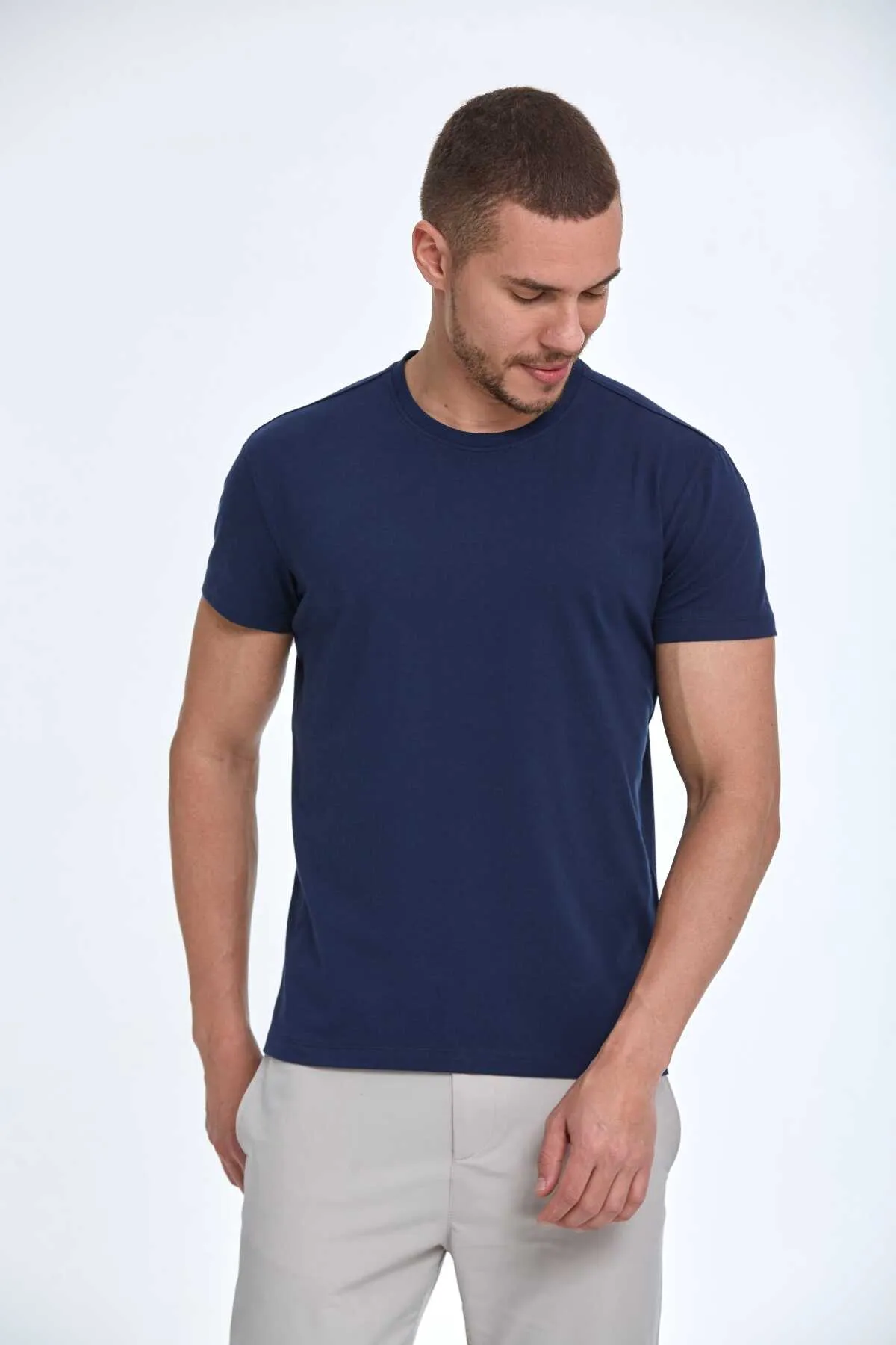 تيشيرت رجالي محبوك بياقة دائرية وتفصيل خطوط ناعمة بلمسة صيفية خفيفة
