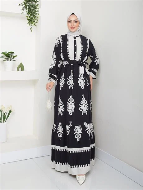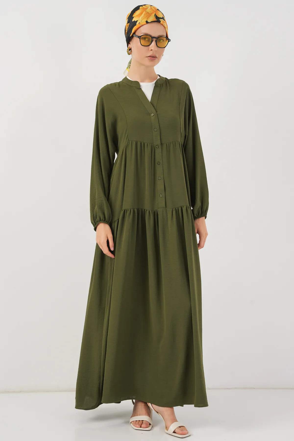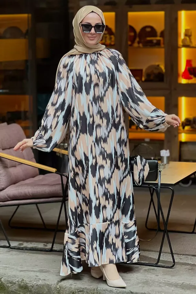 فستان ماكسي مزهر بياقة صينية وأكمام منفوخة محتشم للنساء - Beyond Store