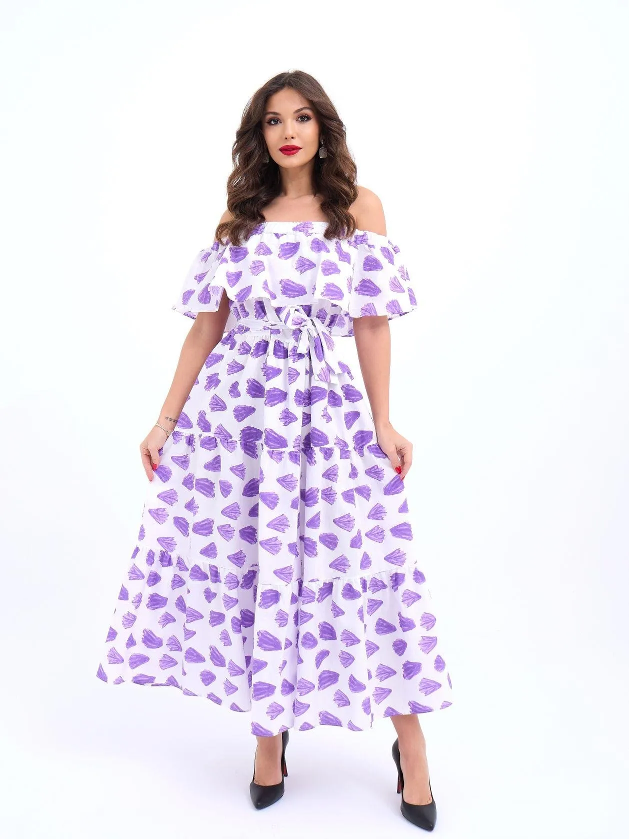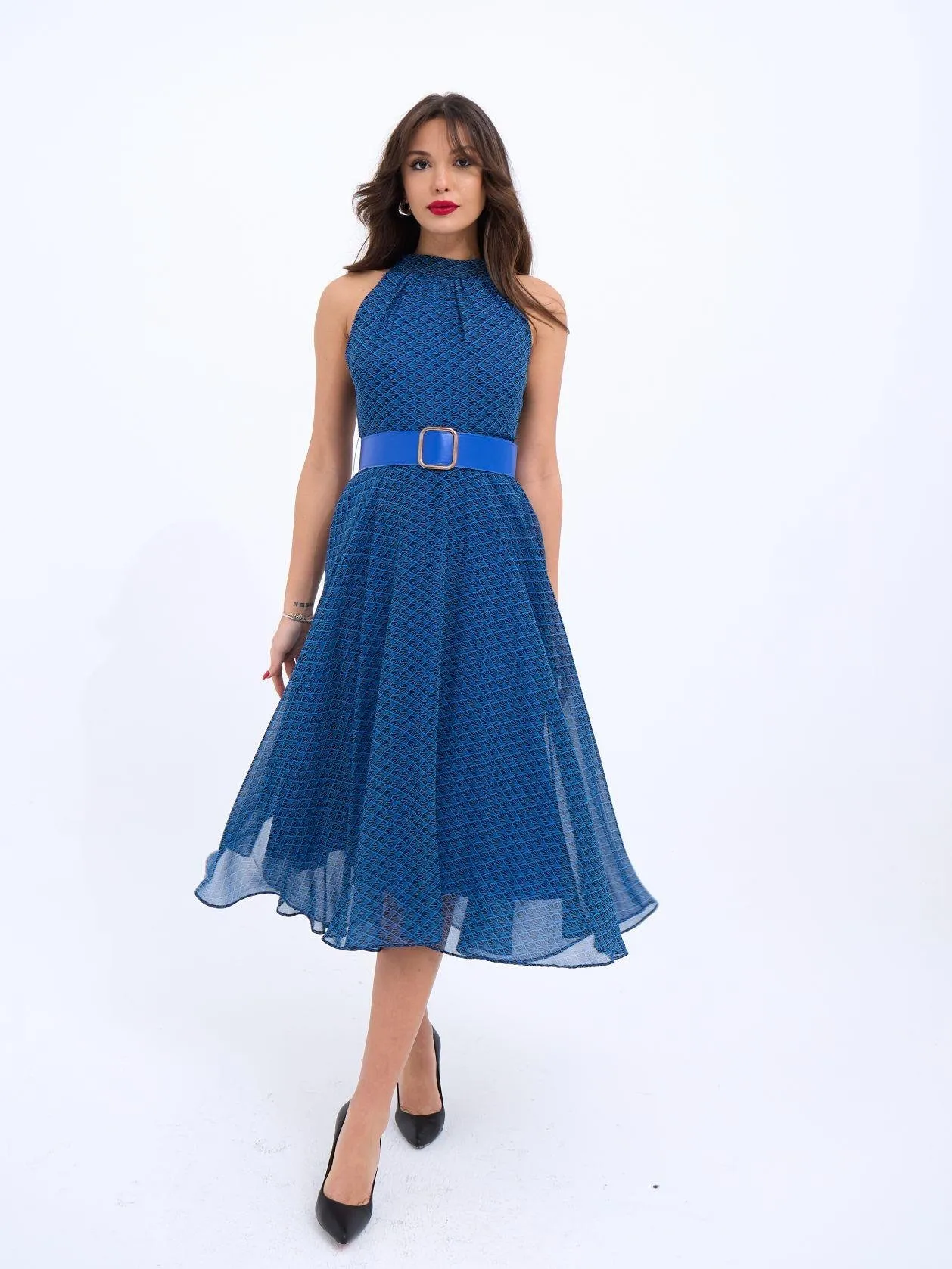 فستان ميدي ضيق بحمالات رفيعة وياقة مربعة مع تفاصيل بكسرات لإطلالة صيفية أنثوية أنيقة للنساء