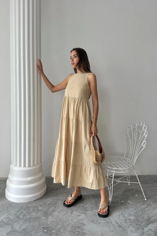 فستان نسائي كتان بقصة A بياقة قميص مع أكمام قصيرة وأزرار أمامية وحزام خصر - Beyond Store