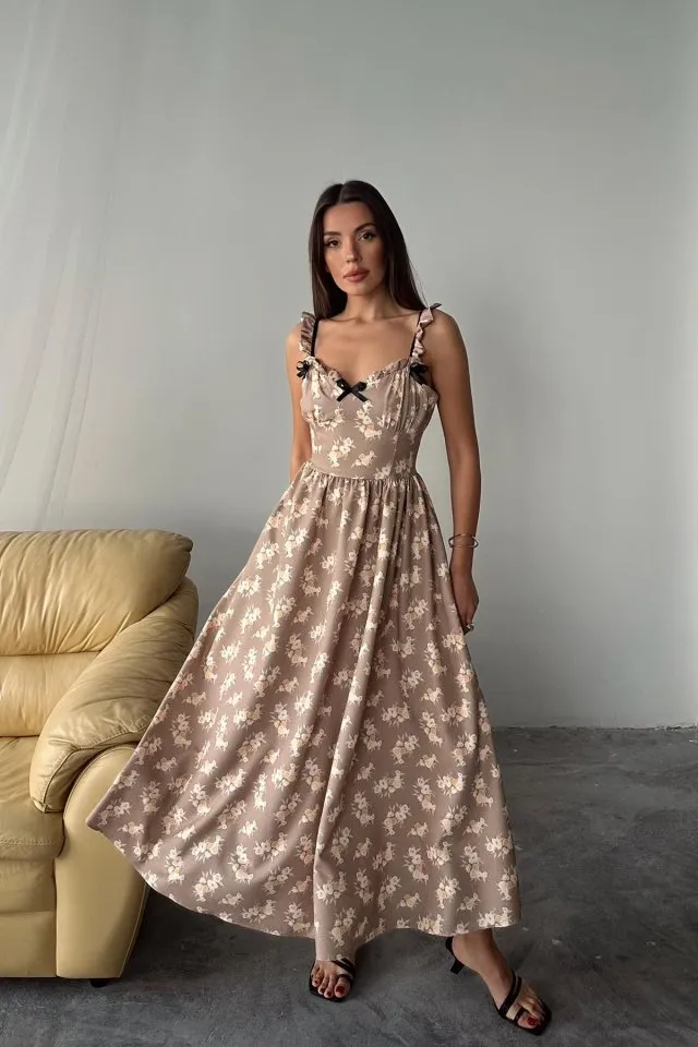 فستان ماكسي كتان منقوش بلونين بياقة V مع أكمام قصيرة وكسرات، خيار منعش لإطلالاتك الصيفية الكاجوال