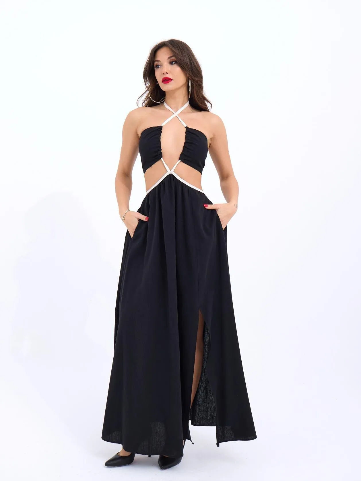 فستان نسائي ميني كلوش مخرم بياقة قلب وحمالات كتف بربطة