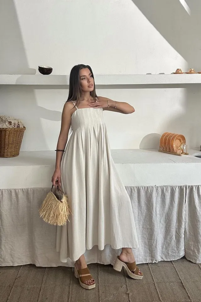 فستان ميني كريب بحمالات رفيعة وتفصيل كسرات وياقة قلب للنساء - Beyond Store