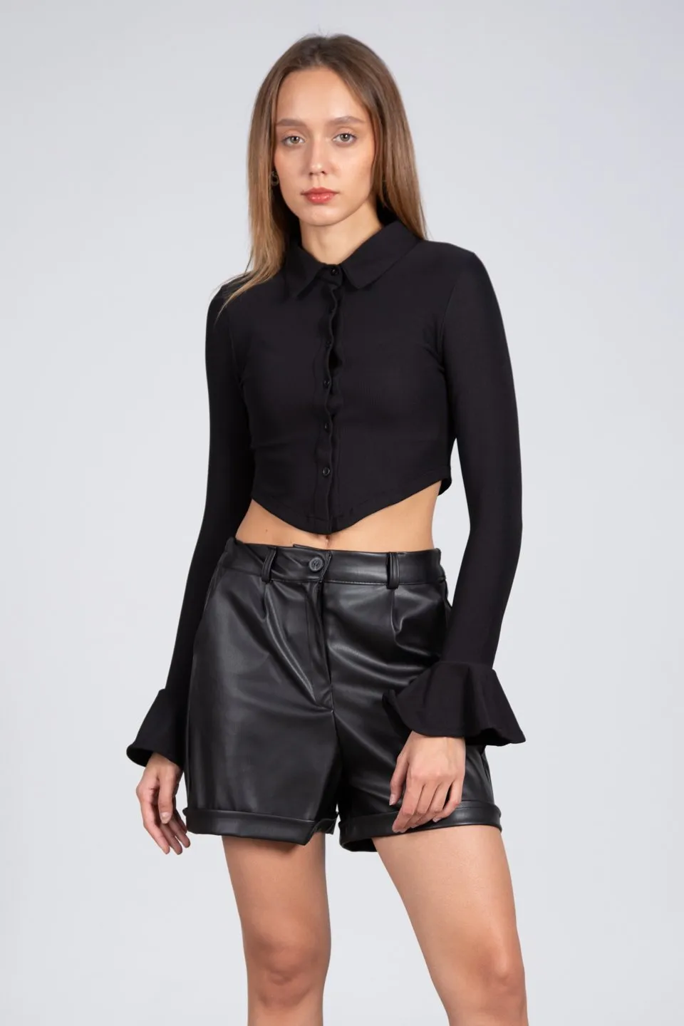 بلوزة كريب أساسية بياقة دائرية وأكمام مكشكشة. تصميم مريح وكاجوال مثالي للمشاوير الصيفية للنساء.
