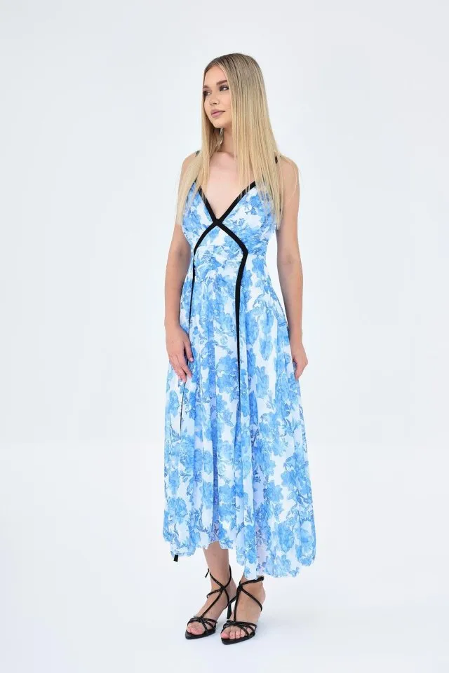 فستان كاجوال بقصة A منقوش مع ياقة دائرية وأكمام قصيرة وجيوب. تصميم مريح وخفيف لأيام الصيف.