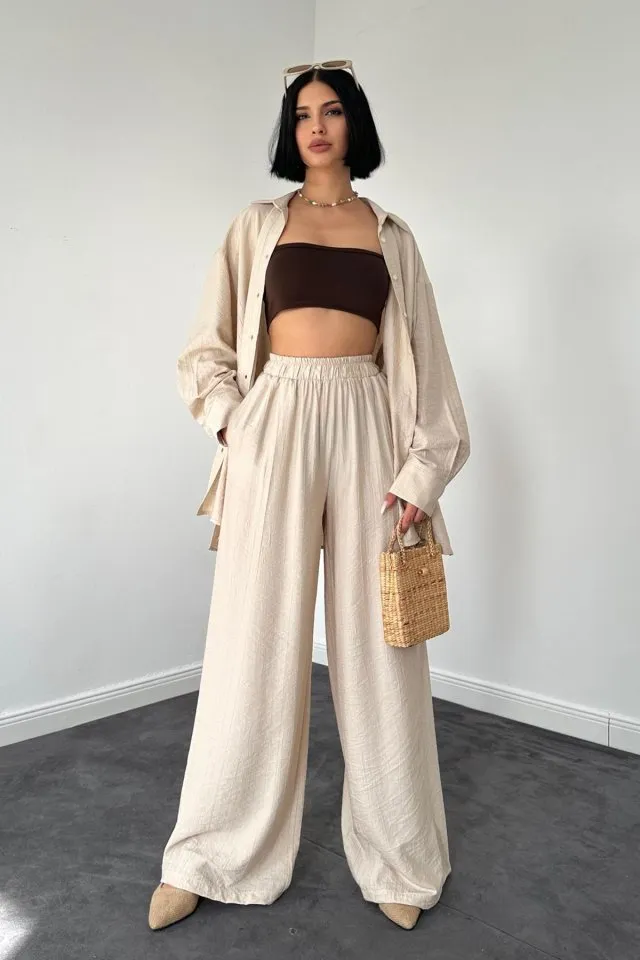 طقم مكون من بلوزة بتفاصيل جانبية مجمعة وبنطلون للنساء - Beyond Store