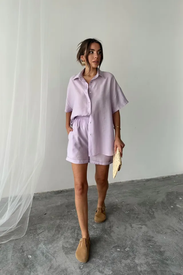 طقم من قطعتين موحد اللون بلوزة واسعة بياقة قارب وشورت بخصر مرن للنساء