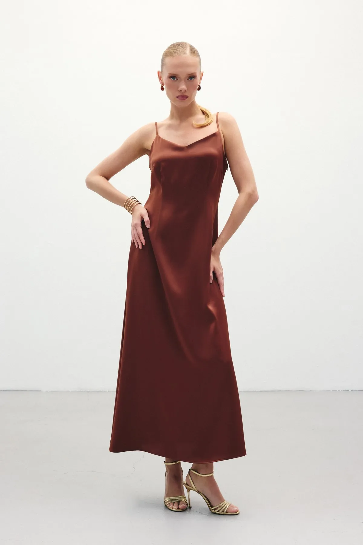 فستان طويل واسع مزين بطيات وحمالات رفيعة ورباط خصر بتصميم أساسي