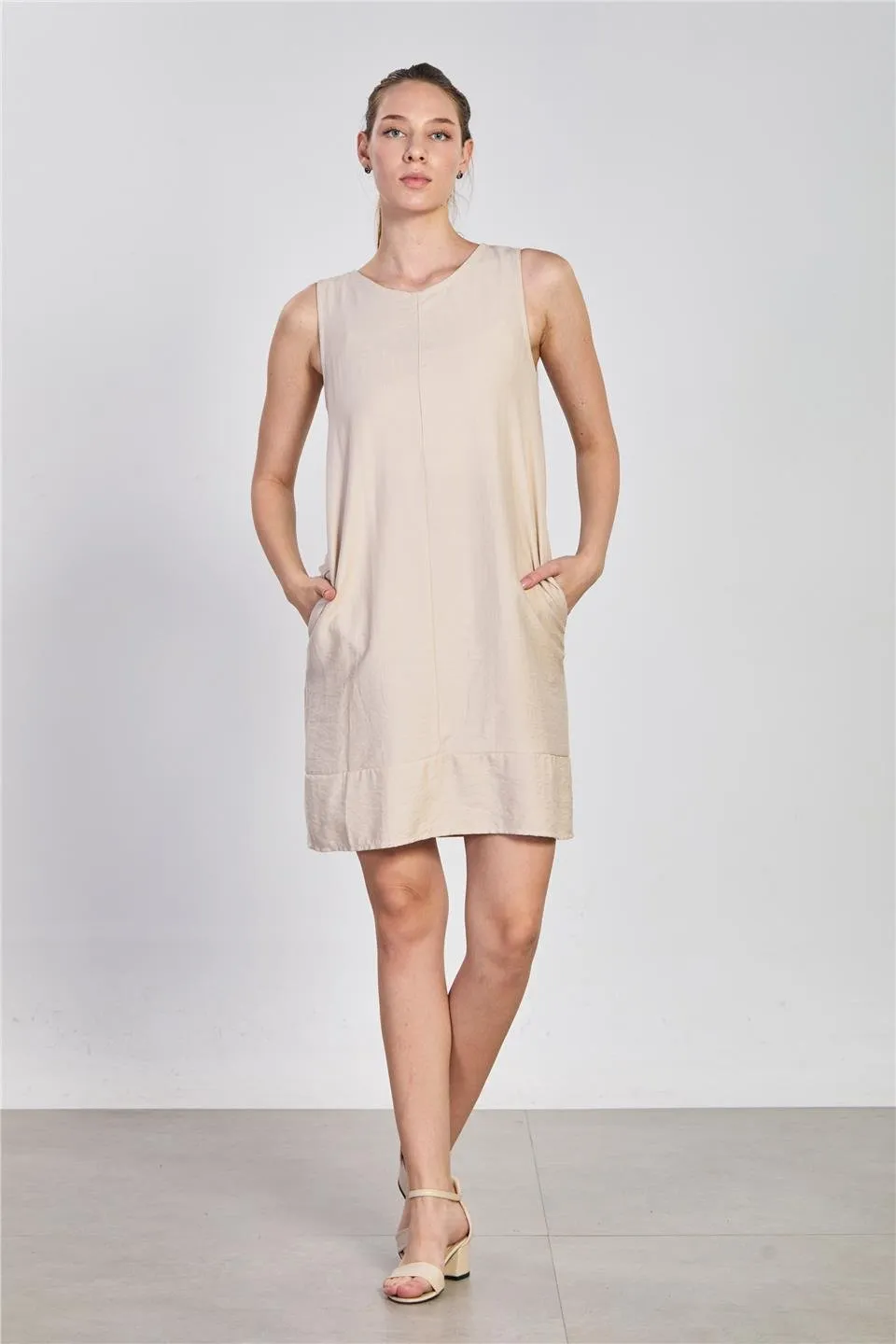 فستان قصير إيروبين بملمس حرير مزين بطيات وياقة V بدون أكمام للنساء - Beyond Store
