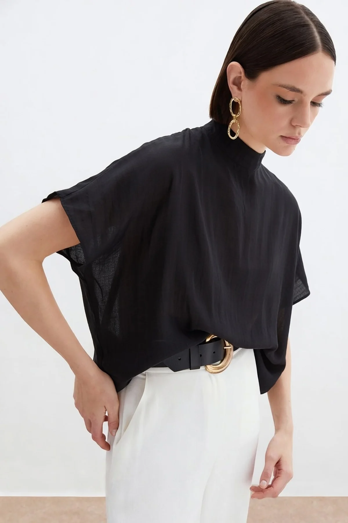 بلوزة ساندي فضفاضة بياقة دائرية وأكمام قصيرة لإطلالة صيفية مريحة وعملية