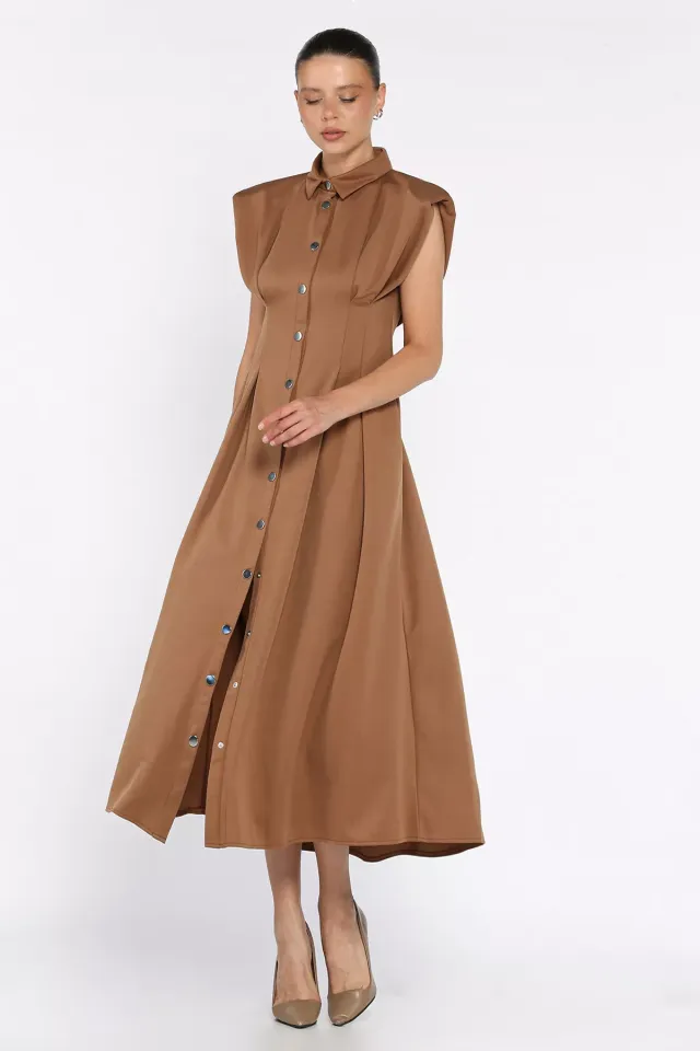 فستان ميدي كتان بياقة قميص وأزرار أمامية كاملة مع حزام خصر وقصة كلوش للنساء - Beyond Store