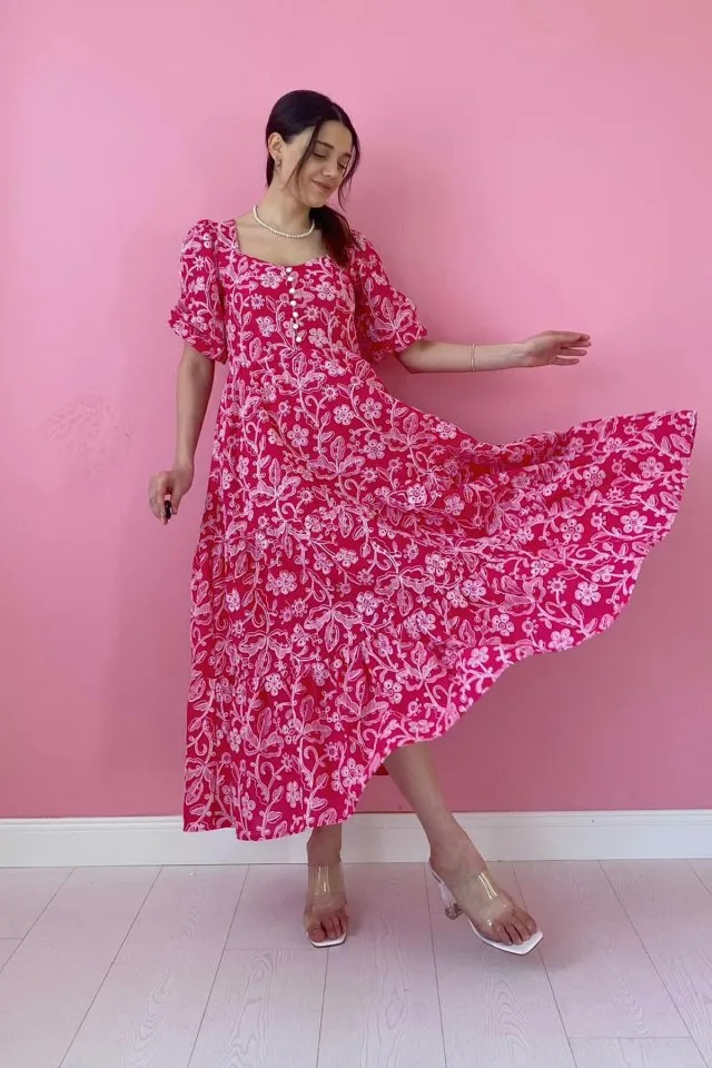 فستان قصير بقصة A شكل من فيسكوز بلون موحد بأكمام دانتيل وياقة دائرية وأكمام قصيرة، لإطلالة صيفية يومية أنيقة ومريحة.