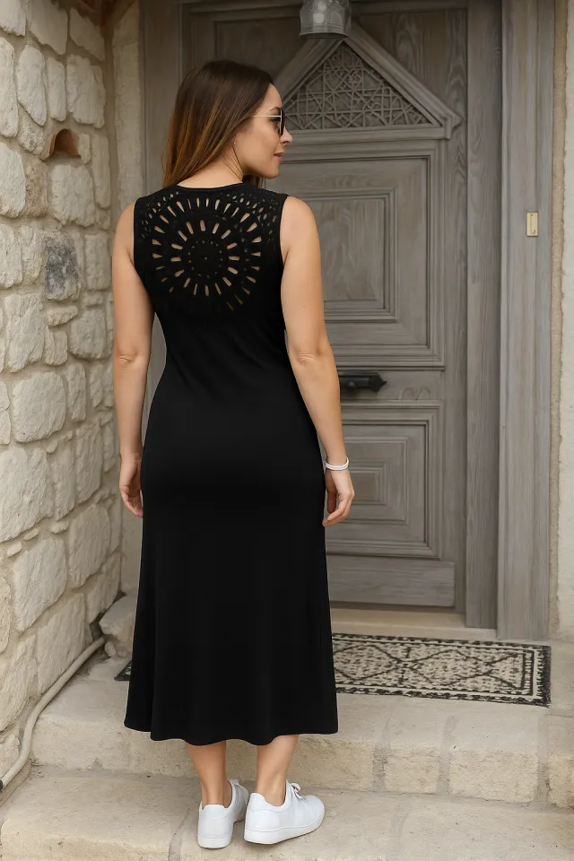 فستان نسائي طويل كلوش من الكتان بكسرات بدون أكمام بياقة دائرية مع تصميم بطبقات - Beyond Store