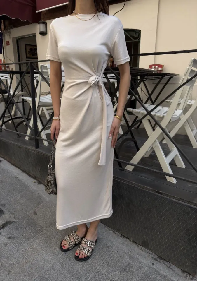 فستان قصير كريب موحد اللون بياقة لف مزدوجة وأكمام بالون مع ربط جانبي وقصة كلوش لإطلالة صيفية منعشة.