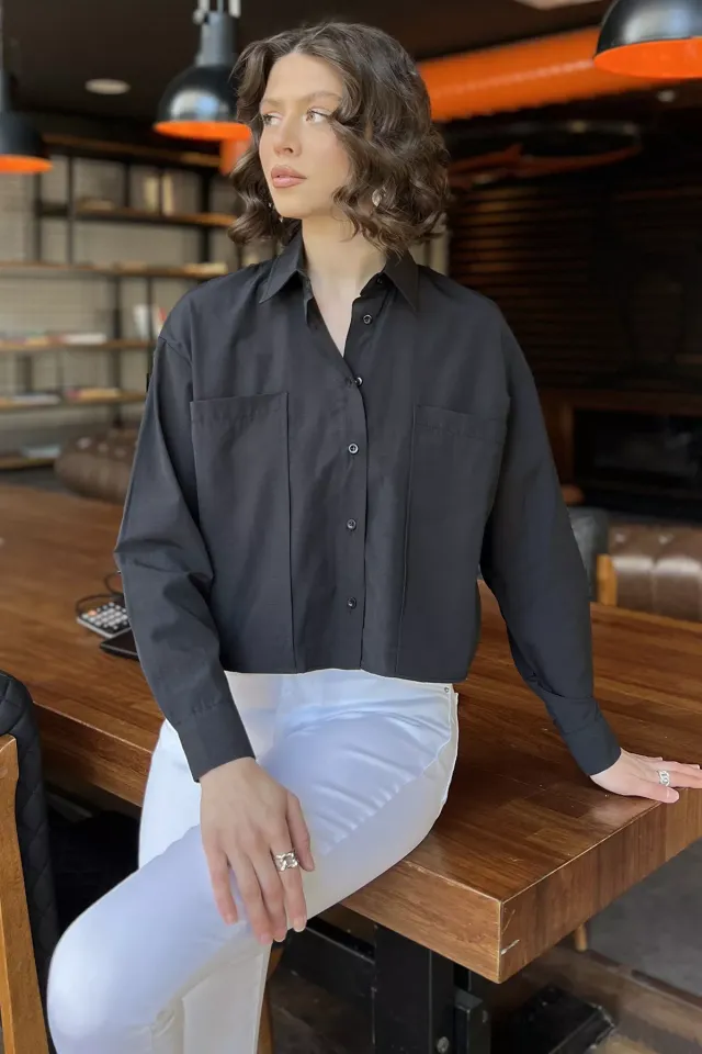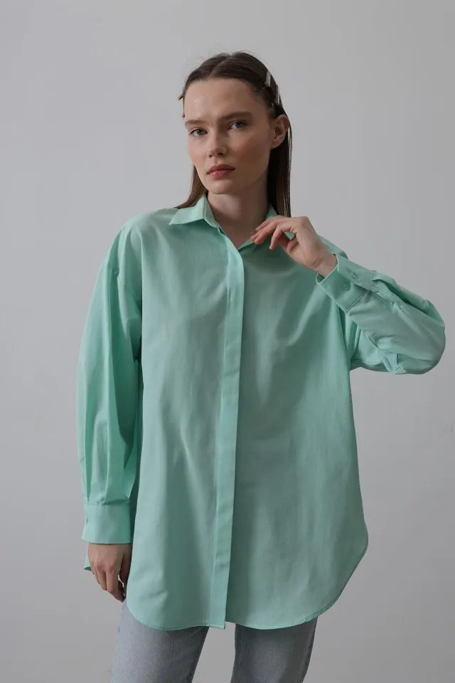 تونيك قميص أوفرسايز بجيبين أماميين وقصة بيضاوية وأكمام طويلة قابلة للطي، خيار عملي للنساء في صيفك اليومي العصري.
