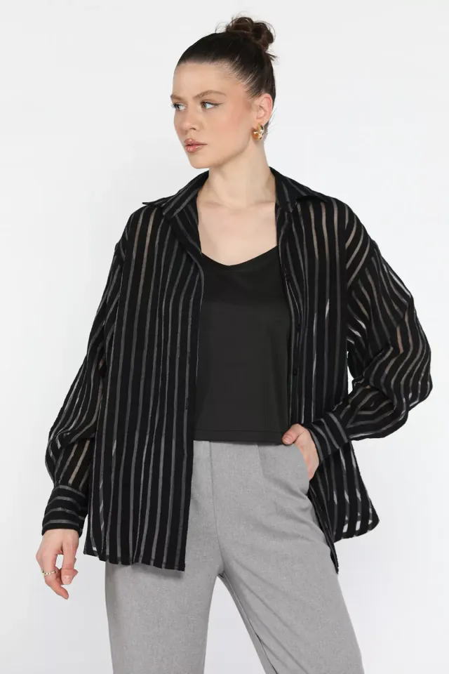 تونيك قميص أوفرسايز بجيبين أماميين وقصة بيضاوية وأكمام طويلة قابلة للطي، خيار عملي للنساء في صيفك اليومي العصري.