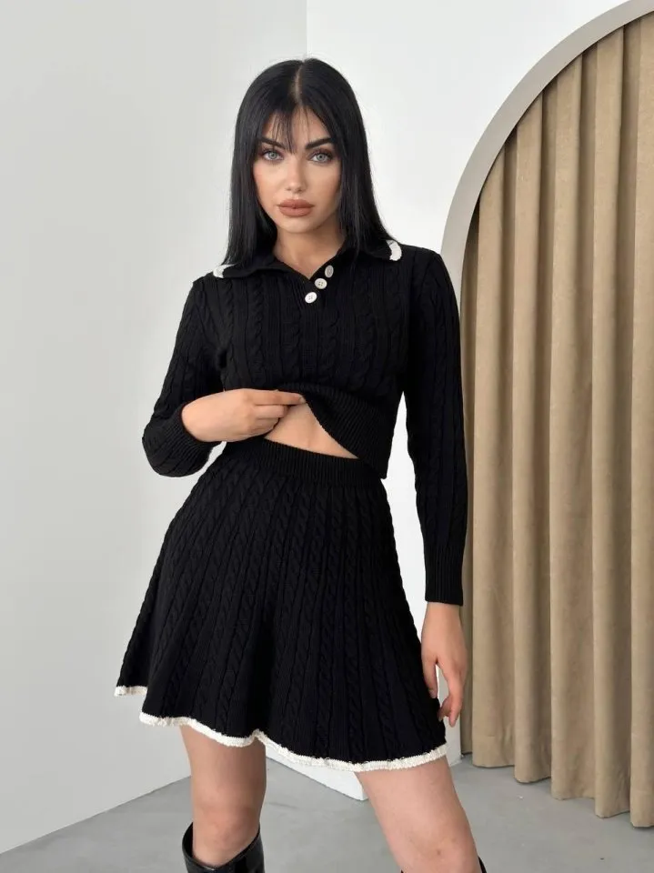 طقم كروب توب بياقة دائرية مع ربطة وتفصيل عصري وتنورة عالية الخصر بنقشة مخططة لإطلالة صيفية للنساء