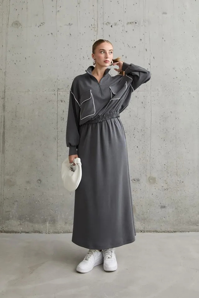 طقم كروب توب بياقة دائرية مع ربطة وتنورة مخططة بخصر عالي للنساء
