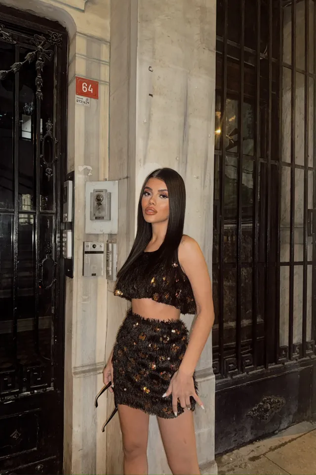 طقم تنورة ماكسي بكسرات وتوب بدون حمالة بياقة قلب وتصميم ريشة مع شق جانبي - Beyond Store