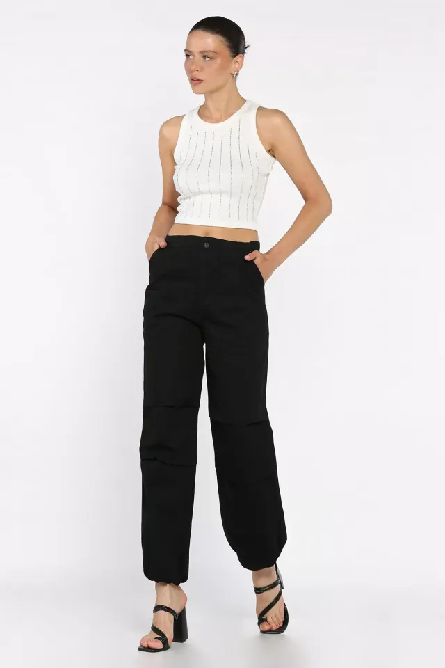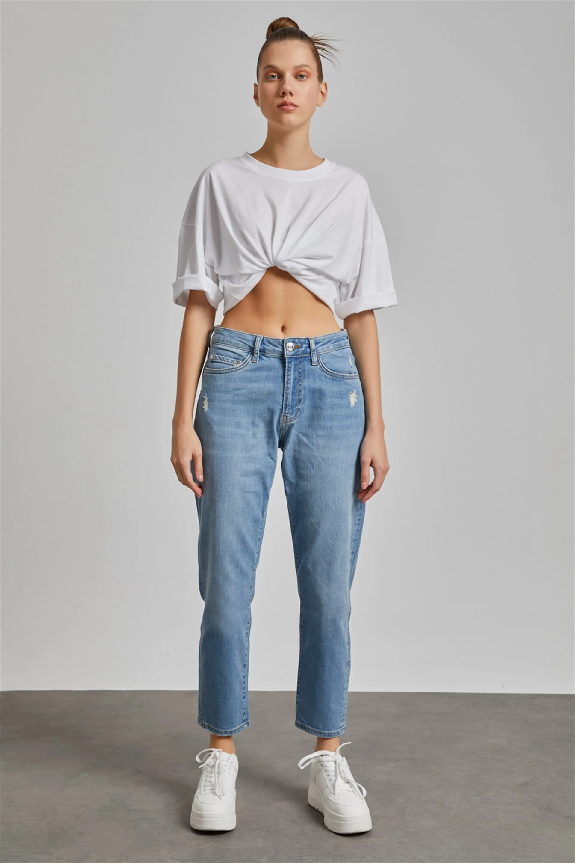 بنطلون جينز نسائية بخصر عالي مع حزام عريض وتفصيل سحاب، خيار عصري عملي لإطلالة صيفية يومية أنيقة.