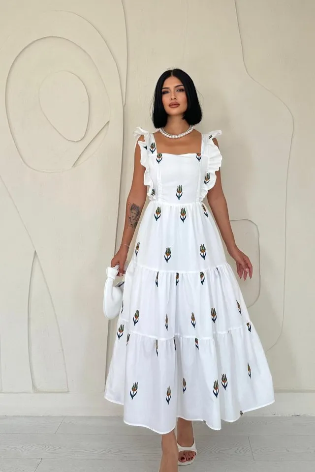 فستان ميدي شيفون بياقة هالتر مع حزام خصر وإغلاق أزرار عند العنق، تصميم مبطن يناسب مختلف المقاسات ويمنح إطلالة صيفية أنيقة ومريحة.