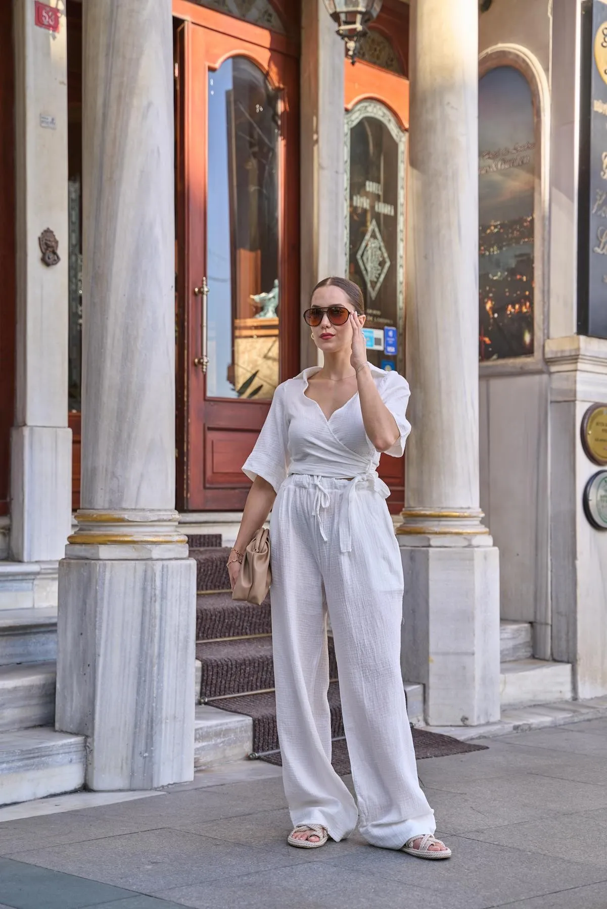 بنطلون بالازو عالي الخصر بقصة واسعة وجيوب جانبية عملية مصنوع من مزيج قطني ناعم يوفر راحة وأناقة متجددة
