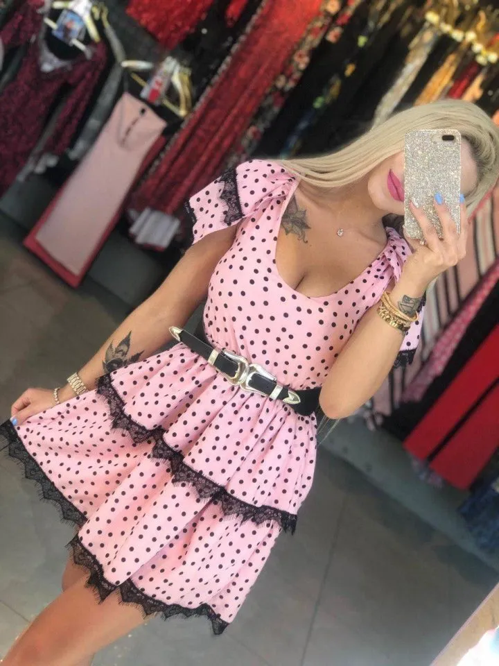 فستان نسائي دانتيل قصير بحمالات رفيعة وتنورة بكسرات