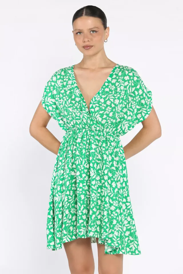 فستان قصير بحمالات رفيعة وتنورة بكسرات مع تطريز دانتيل وبطانة كاملة، مثالي لأجواء الصيف المنعشة.