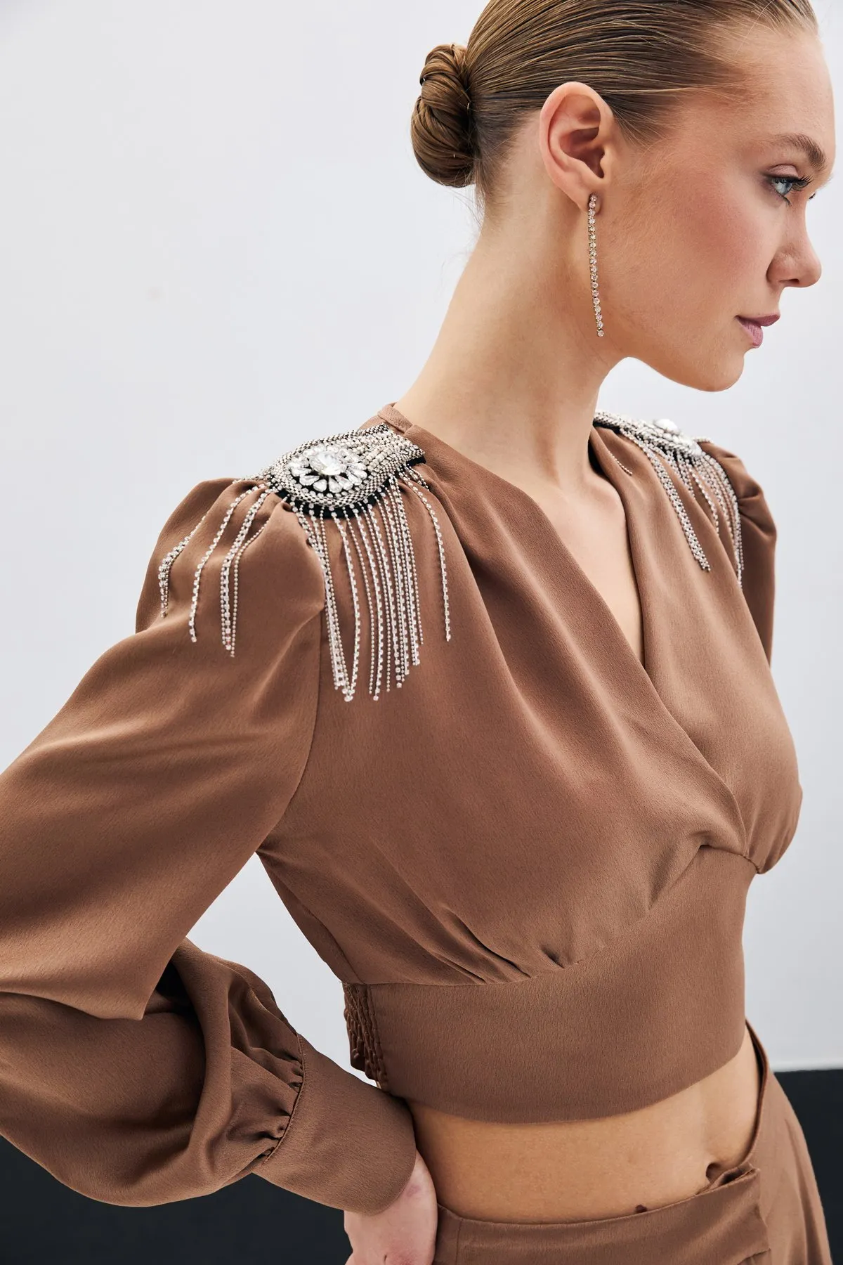 بلوزة نسائية بدون أكمام بياقة على شكل حرف V مزينة بالترتر