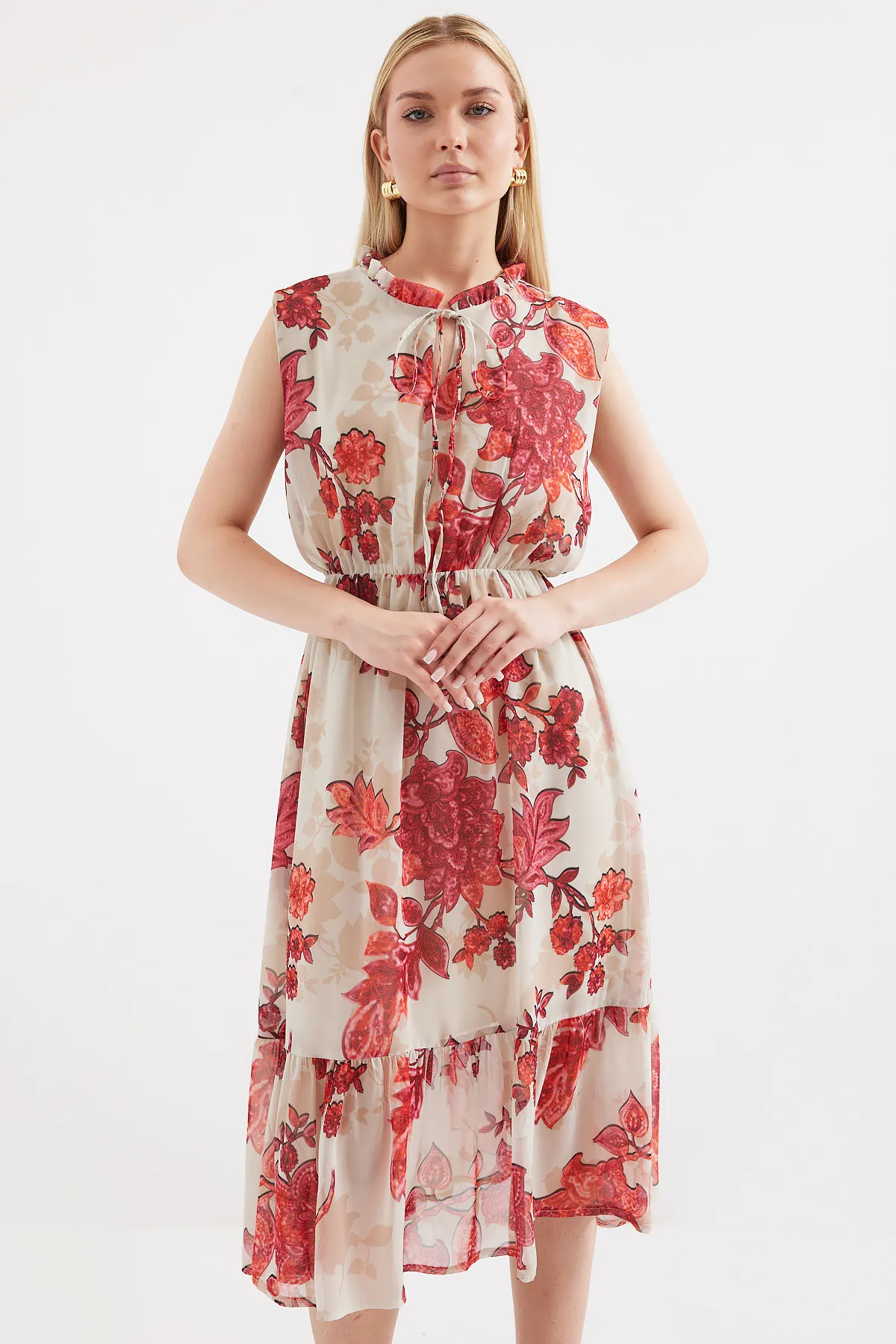فستان نسائي سوبرم بياقة هالتر ونقشة حيوية مع كشكش أسفل الفستان - Beyond Store