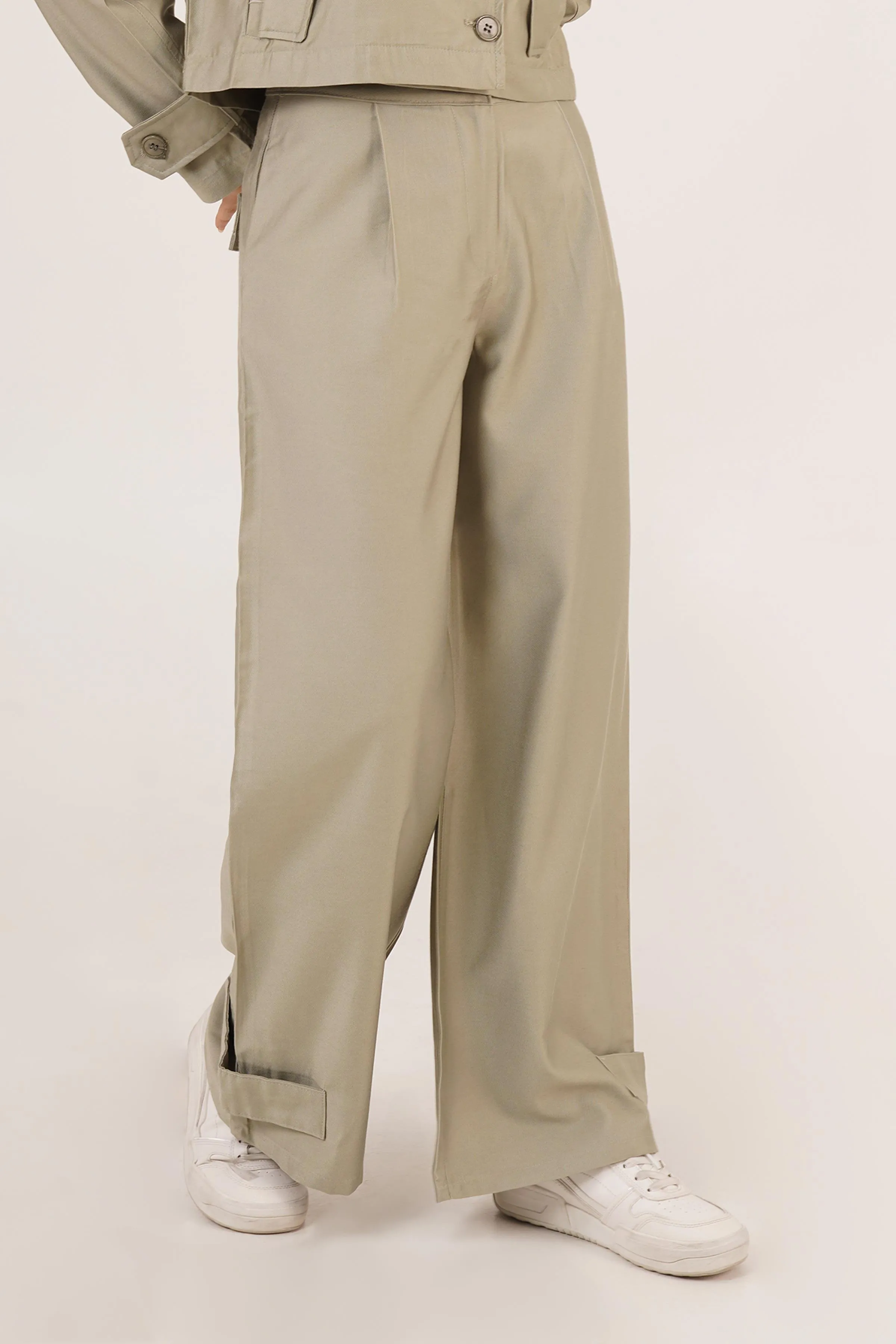 بنطلون خصر عالي بخصر مطاطي وجيوب وتفاصيل معدنية ناعمة تضيف لمسة كيوت للنساء