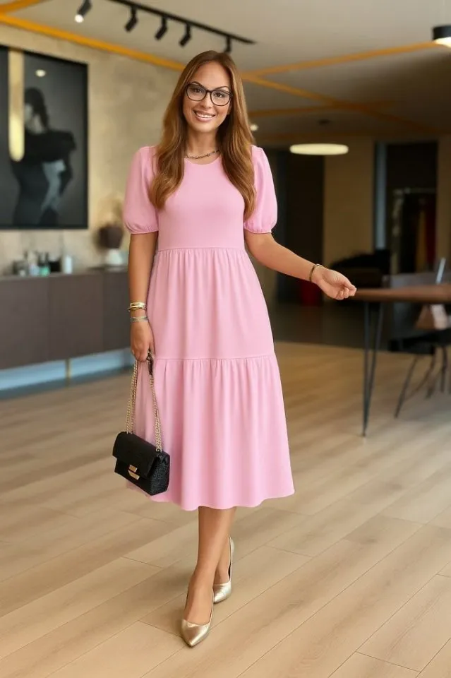 فستان تيشيرت نسائي بياقة دائرية وتفصيل شعار بسيط، تصميم كاجوال عملي يناسب إطلالات الصيف اليومية بكل راحة.